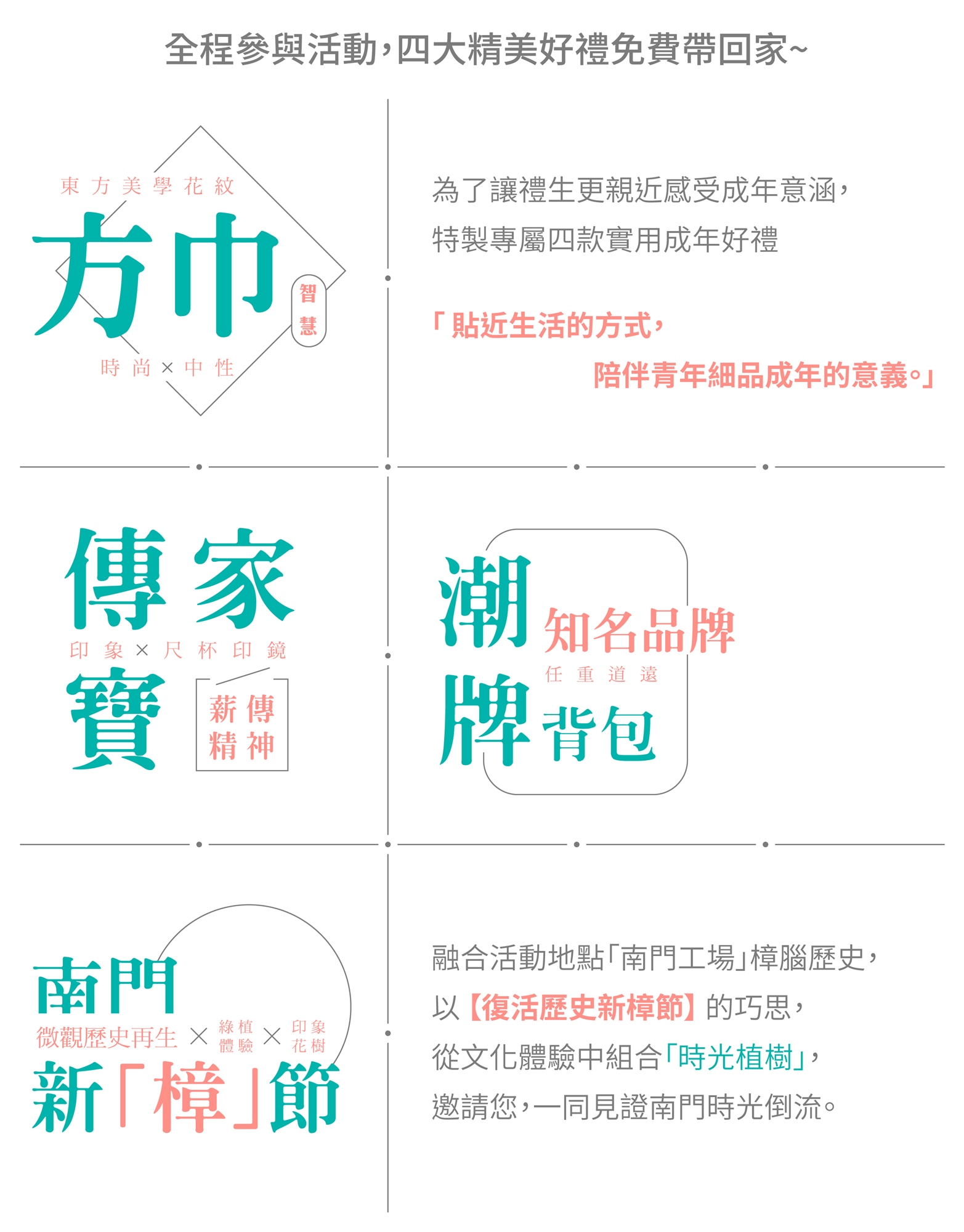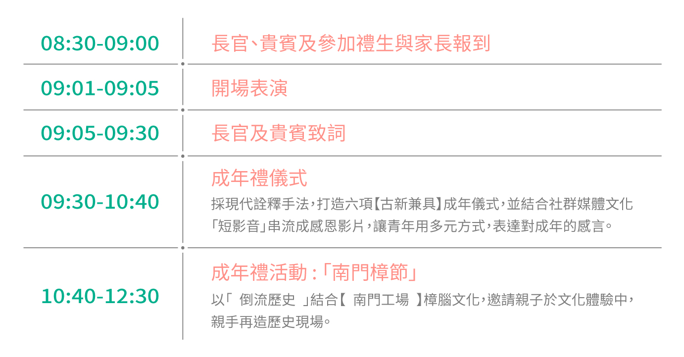 為了讓當代學子在潮流世代,依舊能感受古人的節禮智慧意涵,特別擷取古禮儀式中的精神為發想基礎,以現代新詮釋手法打造六項「古新兼具」的儀式,讓禮生於浸潤活動之際細細體會「成年」的意涵。