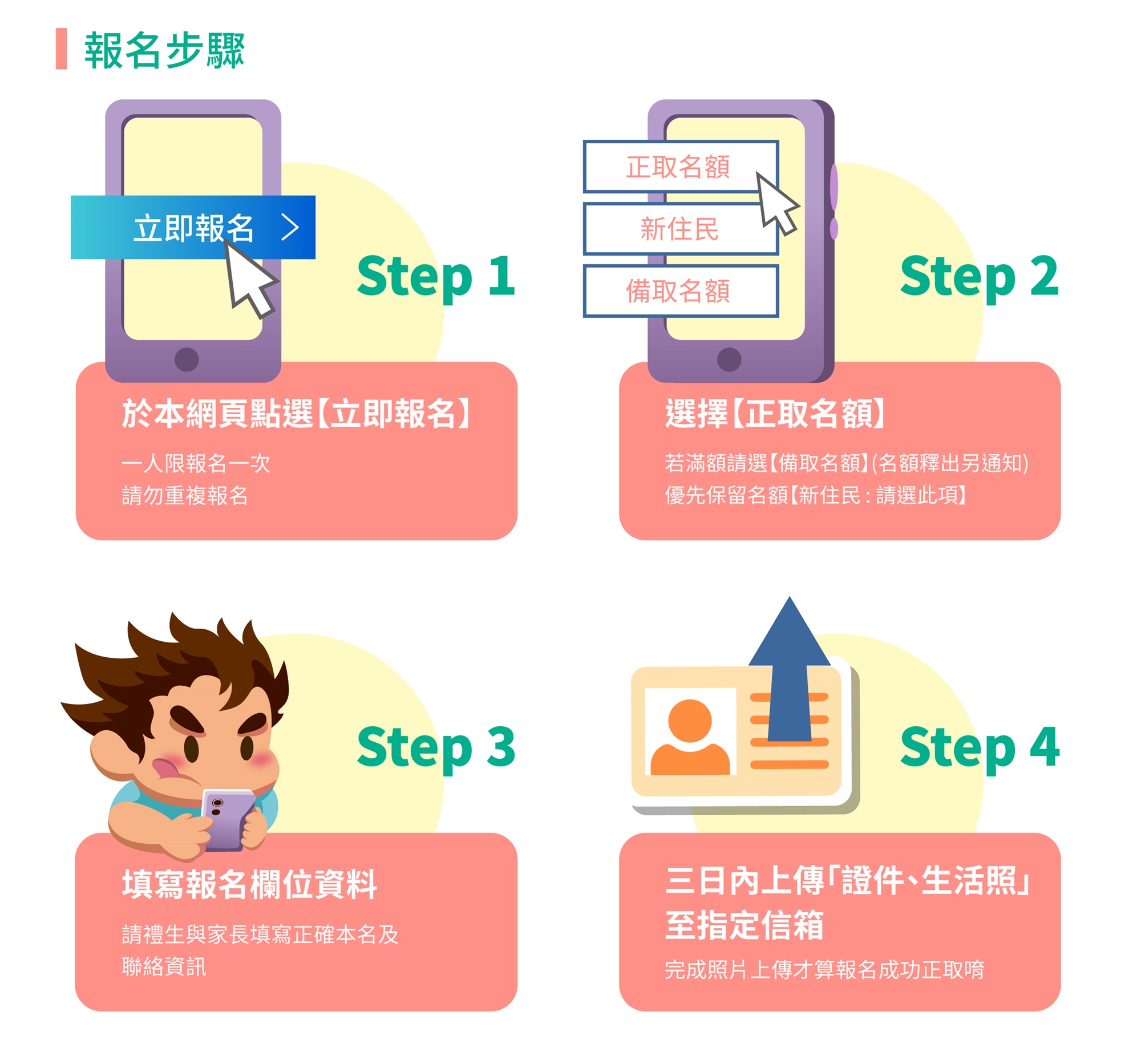 1、完成線上報名之後,需同時上傳「身分證件正反面」及「生活照」,以【就讀資格】報名,需再額外上傳「學生證正反面」以供核對。