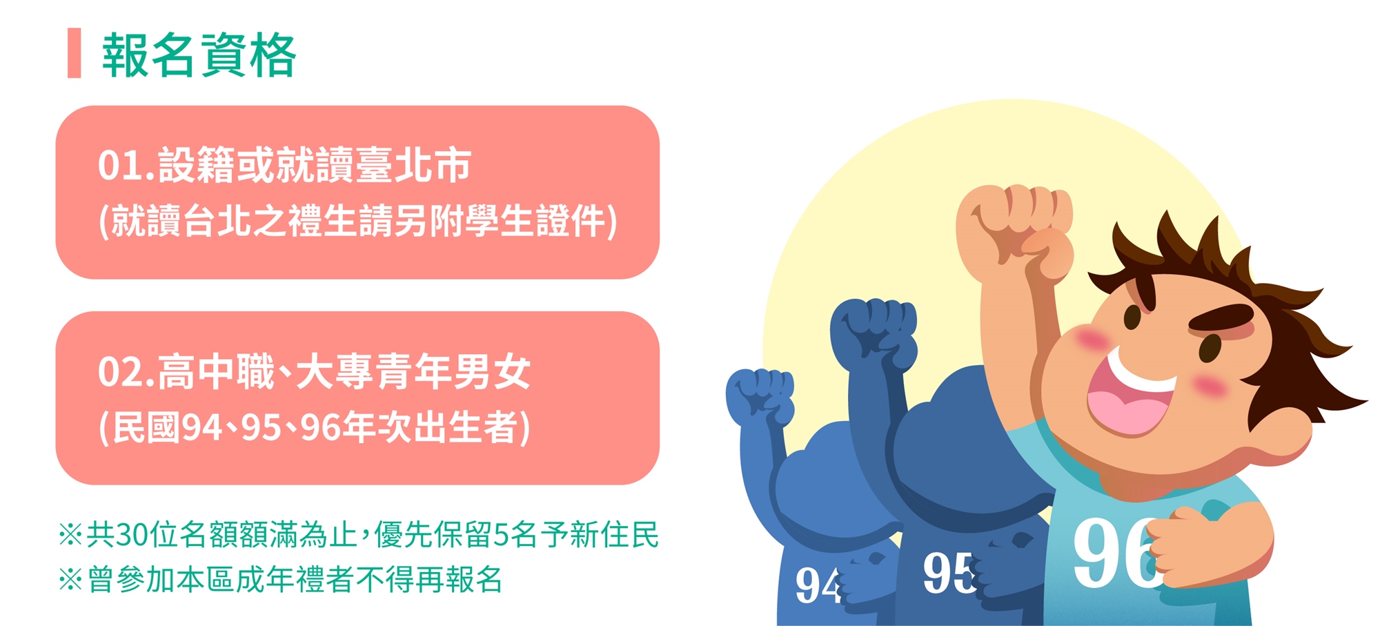 3、須完成提交報名表,同時並繳交身分證明文件及生活照片後才算報名成功正取,逾期經聯繫未補交者視為放棄資格。