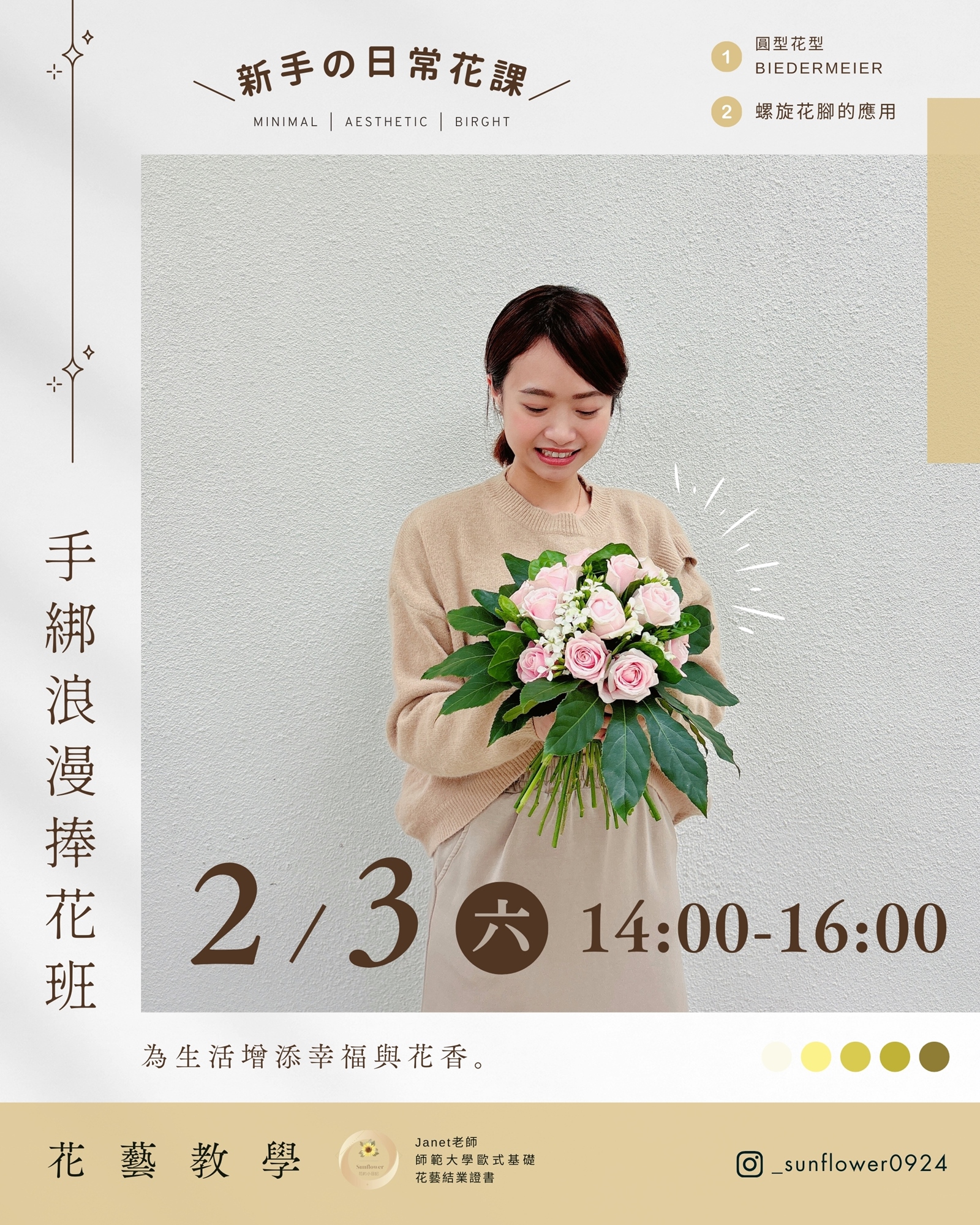 Janet 老師將教您如何使用簡單的花紙和綁帶,以一種令人驚艷的方式製作出美麗的花束,為您的心愛之人帶來驚喜和愛意。無論您是想學習花藝的基礎知識,還是想提升包花束的技能,我們都能滿足您的需求。