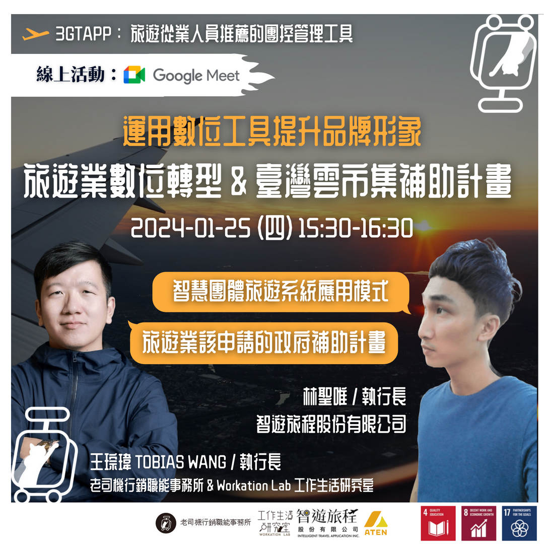 隨著數位科技的不斷進步,旅遊業正經歷著一場全新的轉型浪潮。誠摯邀請您參與【線上】旅遊業數位轉型活動,共同探討最旅遊業必學的技術與帶團趨勢,以及針對旅遊業應該申請的臺灣雲市集補助 - 旅遊從業人員所推薦的團控管理工具。
