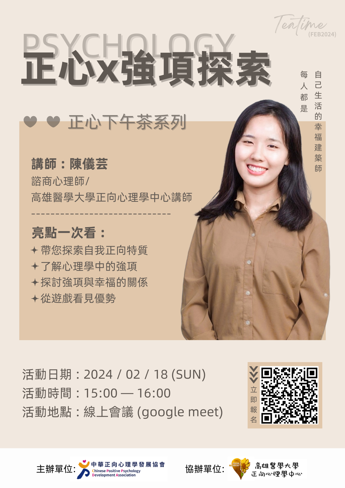 正心下午茶為中華正心協會為推廣正向心理學所做的活動~每個月固定推出一次,講座時長為一個小時,費用為完全免費!在2024年二月,我們邀請了心理師陳儀芸蒞臨講堂!邀請大家把生活放慢腳步,一起探索內心的「正向特質」🌼