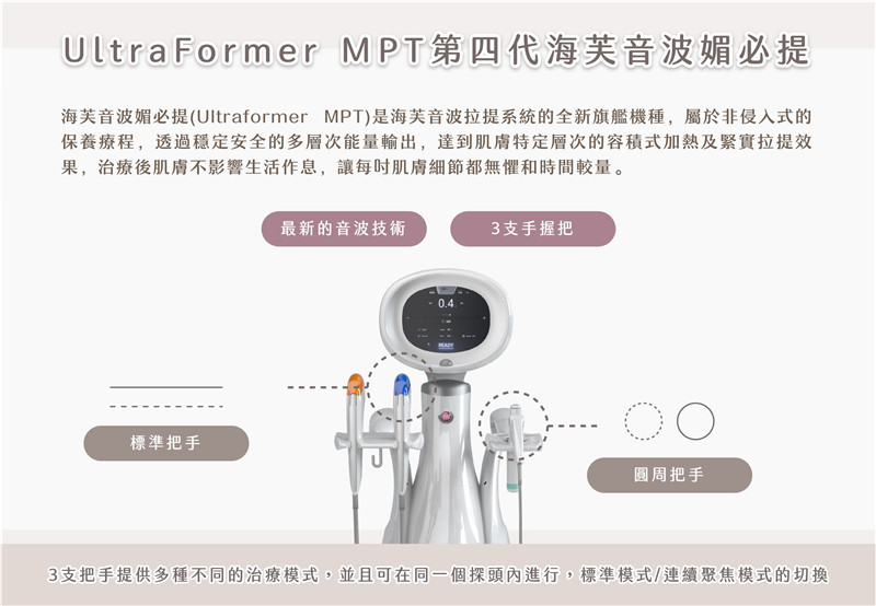 海芙音波媚必提(Ultraformer MPT)是海芙音波拉提系統的全新旗艦機種,屬於非侵入式的保養療程,透過穩定安全的多層次能量輸出,達到肌膚特定層次的容積式加熱及緊實拉提效果,治療後肌膚不影響生活作息,讓每吋肌膚細節都無懼和時間較量。