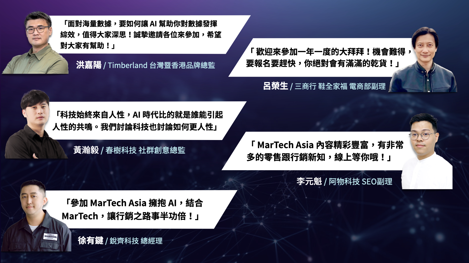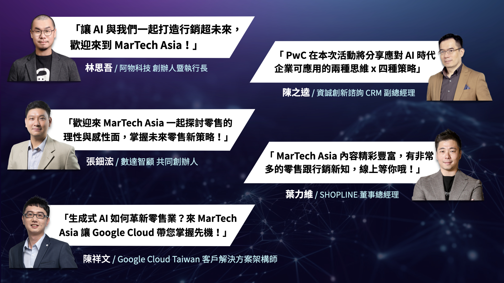 主軸鎖定在新零售布局策略、MarTech 應用、AI 科技、數據分析、品牌經營、行銷戰術的全面經驗,邀請深具數位行銷豐厚經驗的企業領導者、產業專家、實戰顧問等講師,分享市場脈動、產業趨勢以及觀點洞察,也藉由 MarTech Asia 望能凝聚亞洲行銷科技圈,共創產業新高峰!