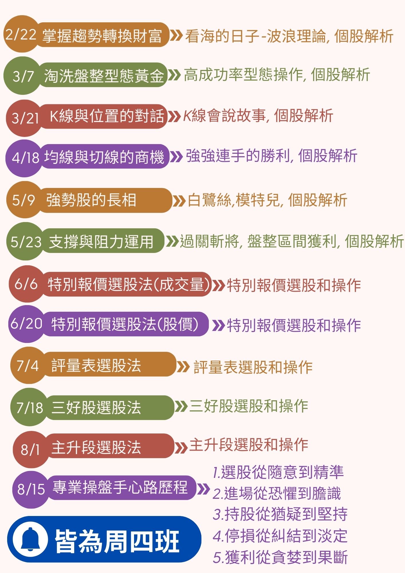 讓同學觸類旁通,將片斷技術分析串連貫通,成為一張完整的拼圖,如此同學研習技術分析時,才能舉一反三,最後熟能生巧 - 後6堂課: