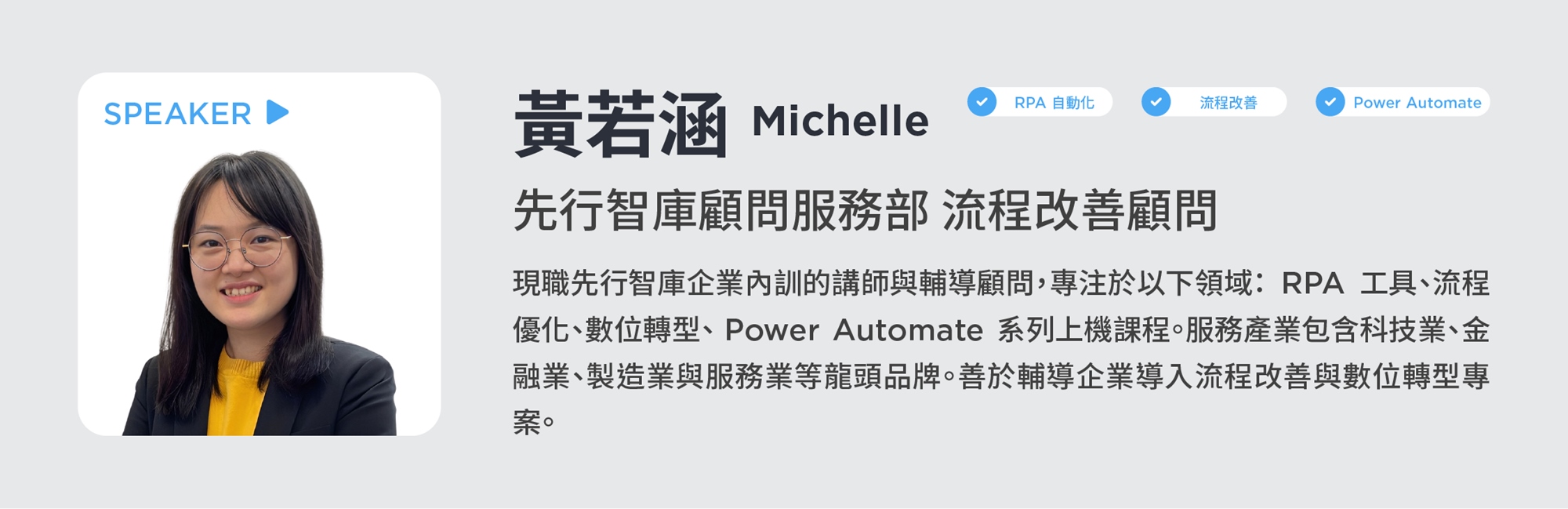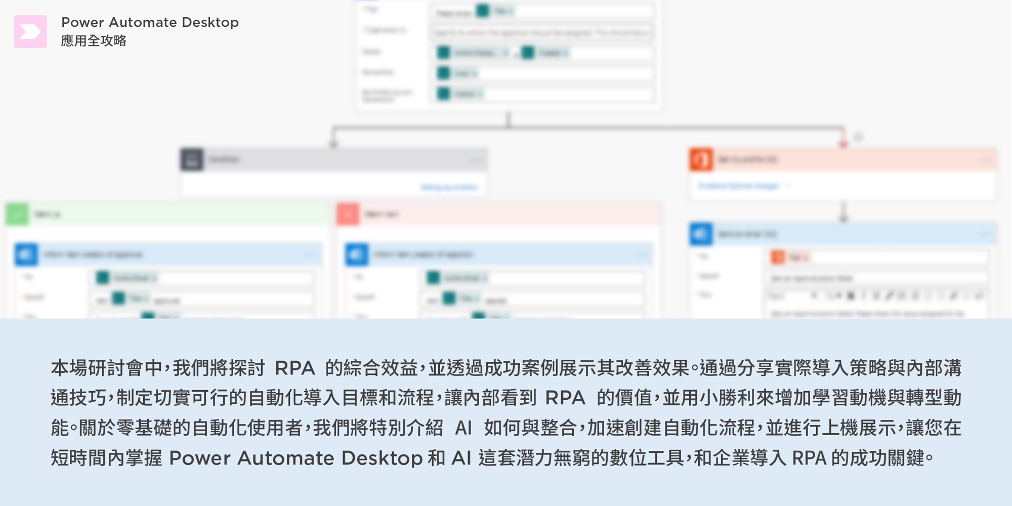我們將在研討會分享過往的執行經驗,結合上機演示,讓大家了解如何用 RPA 工具 Power Automate Desktop 建立流程。