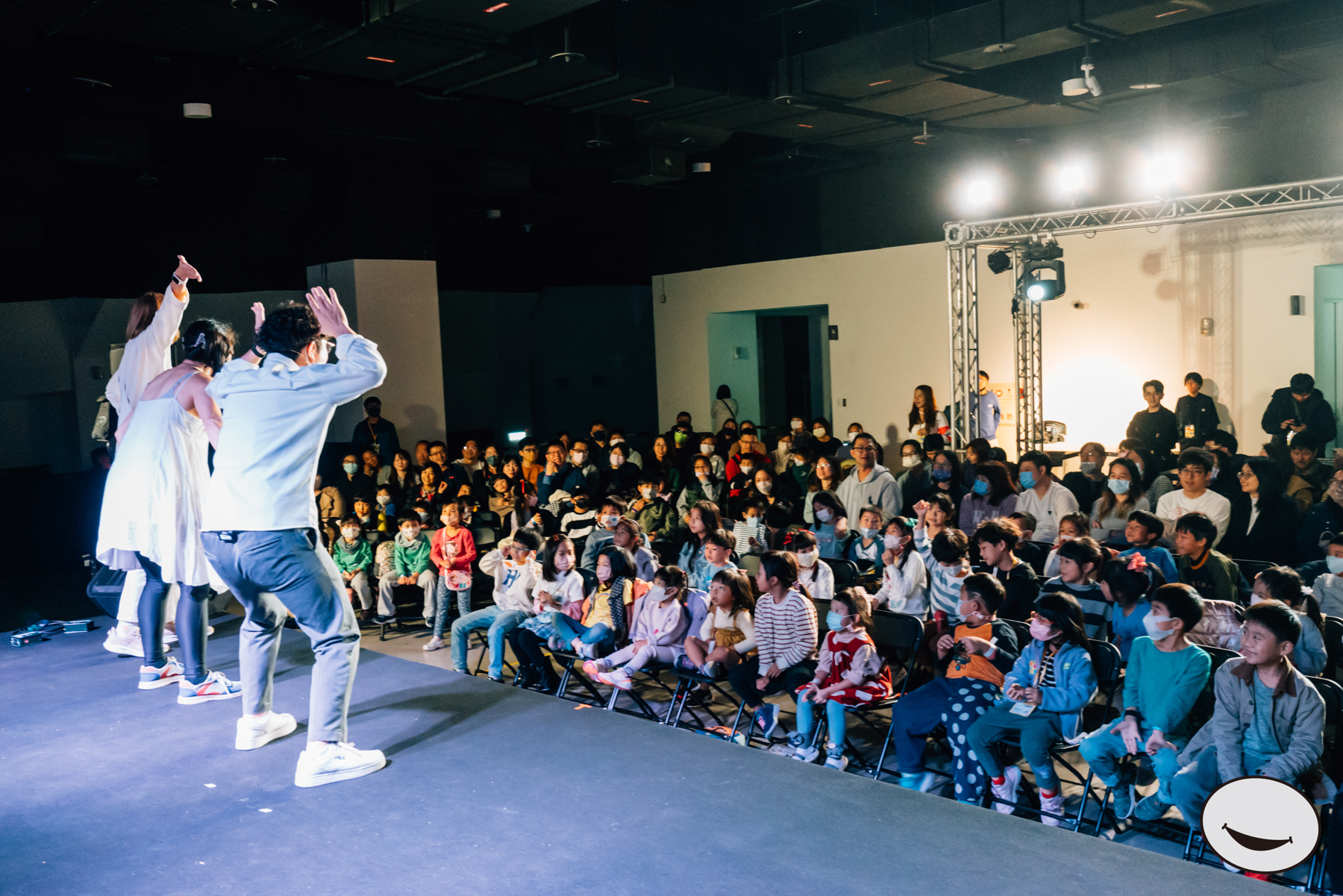 A:爸爸媽媽或是一同前來的大人們會有座位區,可以讓小朋友在前方與其他同齡孩子一起享受;也可以是與小朋友一同坐著觀賞與討論故事。