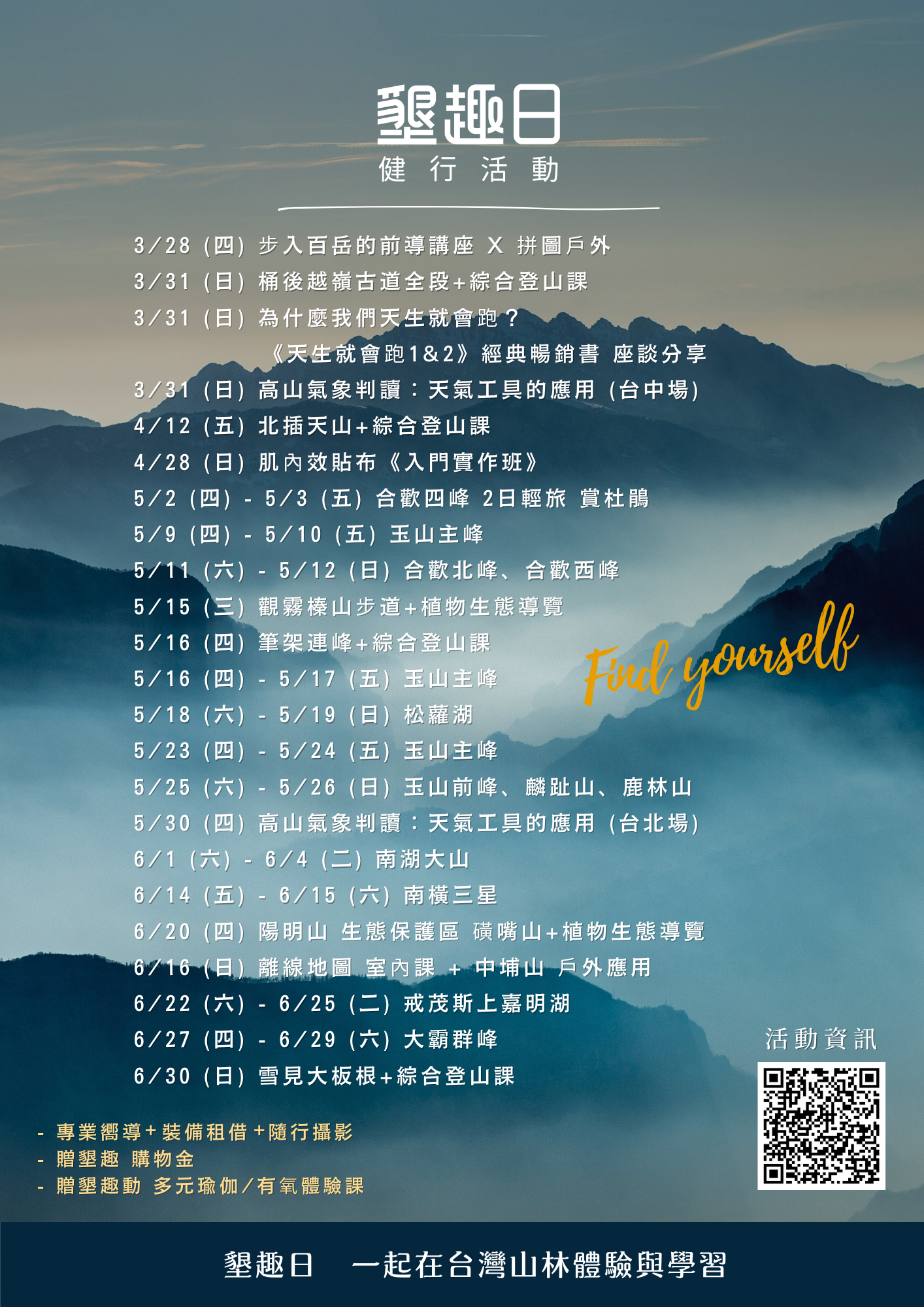 報名回饋:送 $1000 墾趣購物卷、免費體驗【墾趣動】登山肌力皮拉提斯課 1堂