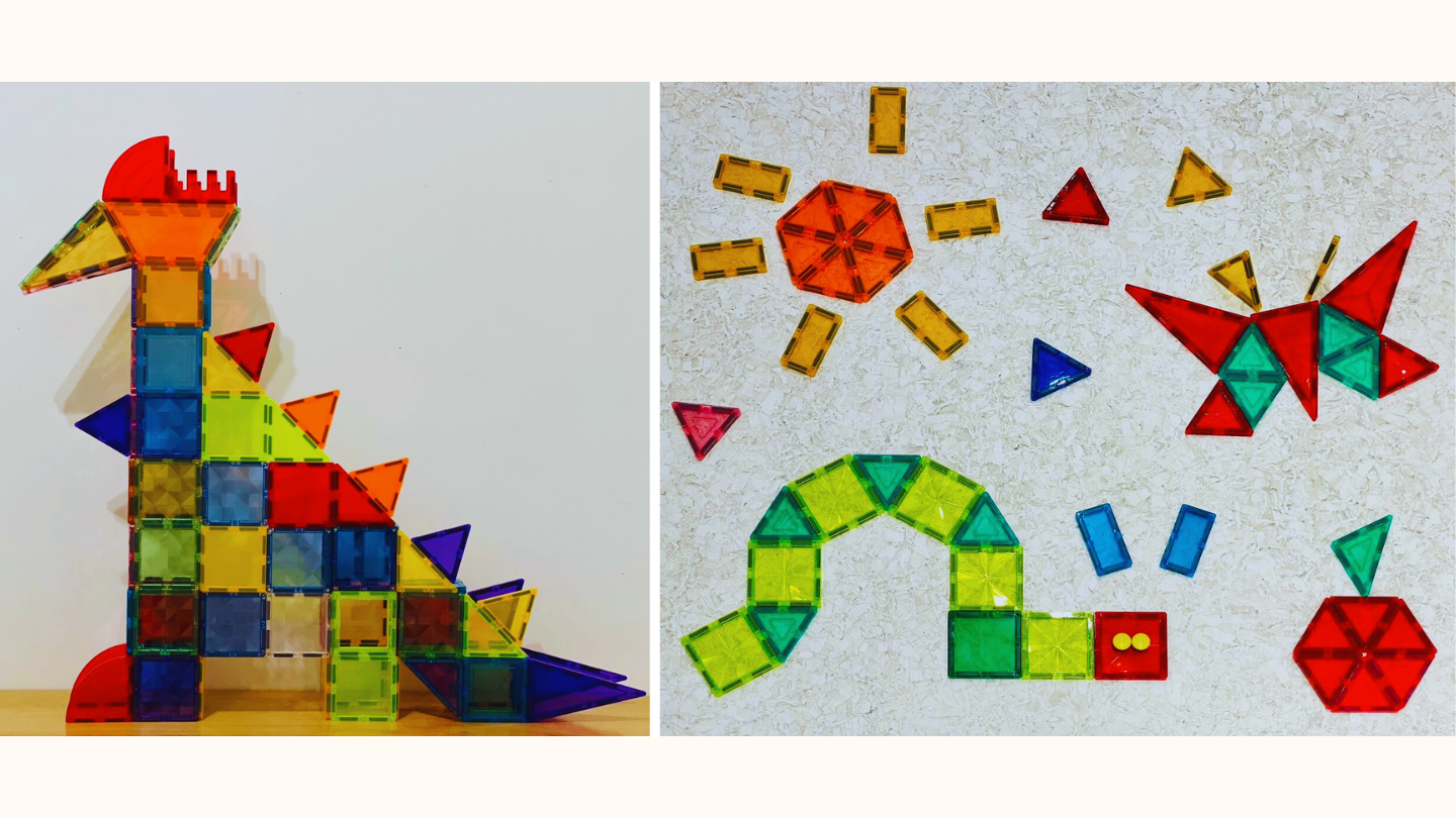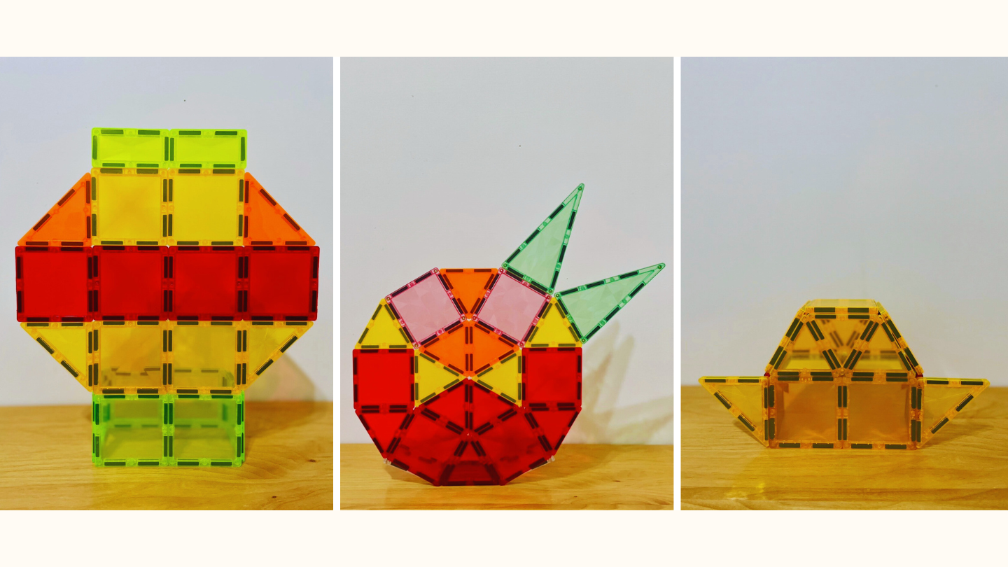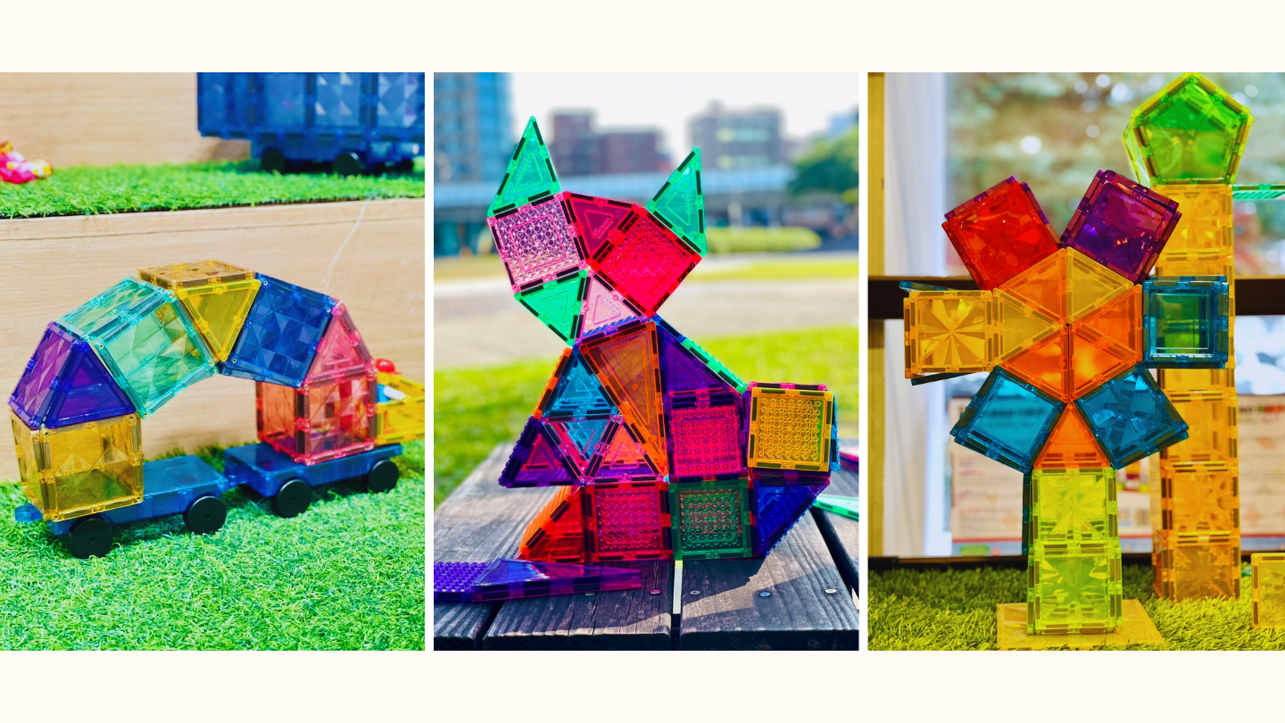 課 程 重 點 :孩子將會在課程中透過磁力片特有的形狀,組合成不同大小的的正方形、三角形、長方形,促進對形狀的認識、大小的概念,及手眼協調。