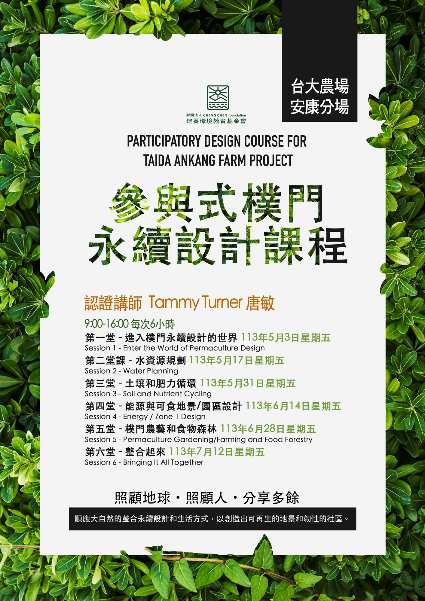 本課程是一門客製化的參與式樸門永續設計課程。不是樸門永續設計認證課程(PDC),不會授予