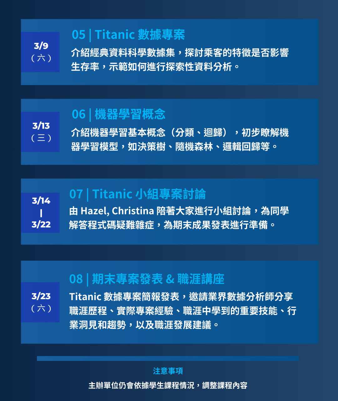 - 除了上述的始業式與結業式以外,本課程將於每週三、六 20:00-22:00 線上授課,恕不開放授課時錄影或補課喔。