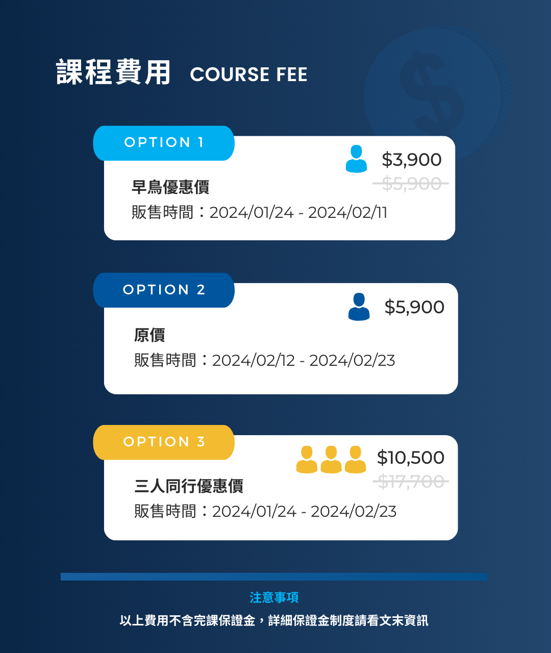- (1/24-2/23)團報優惠價:3 人,每人 3,500 元+ 完課保證金 2,000 元