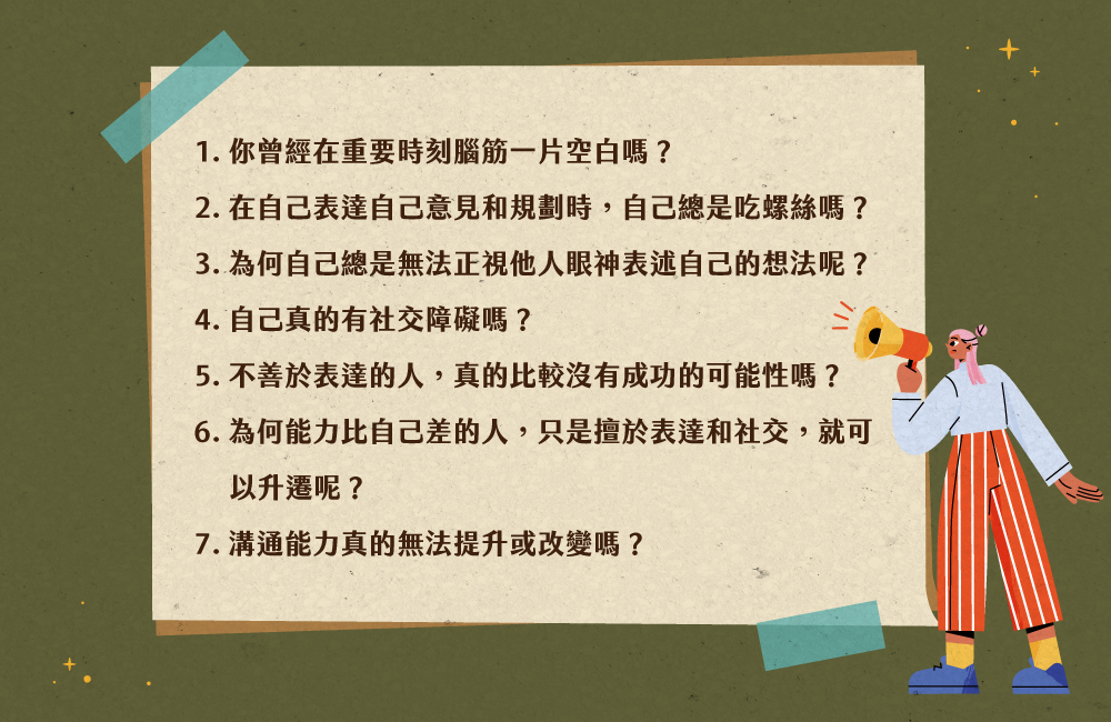 為何跟他人比起來,自己的講話感覺邏輯不太通順、容易緊張、吃螺絲,甚至是說的跟想的不一樣,明明自己日常表述的狀態沒那麼糟糕,到底該怎麼讓自己可以沈穩的與任何人溝通呢?