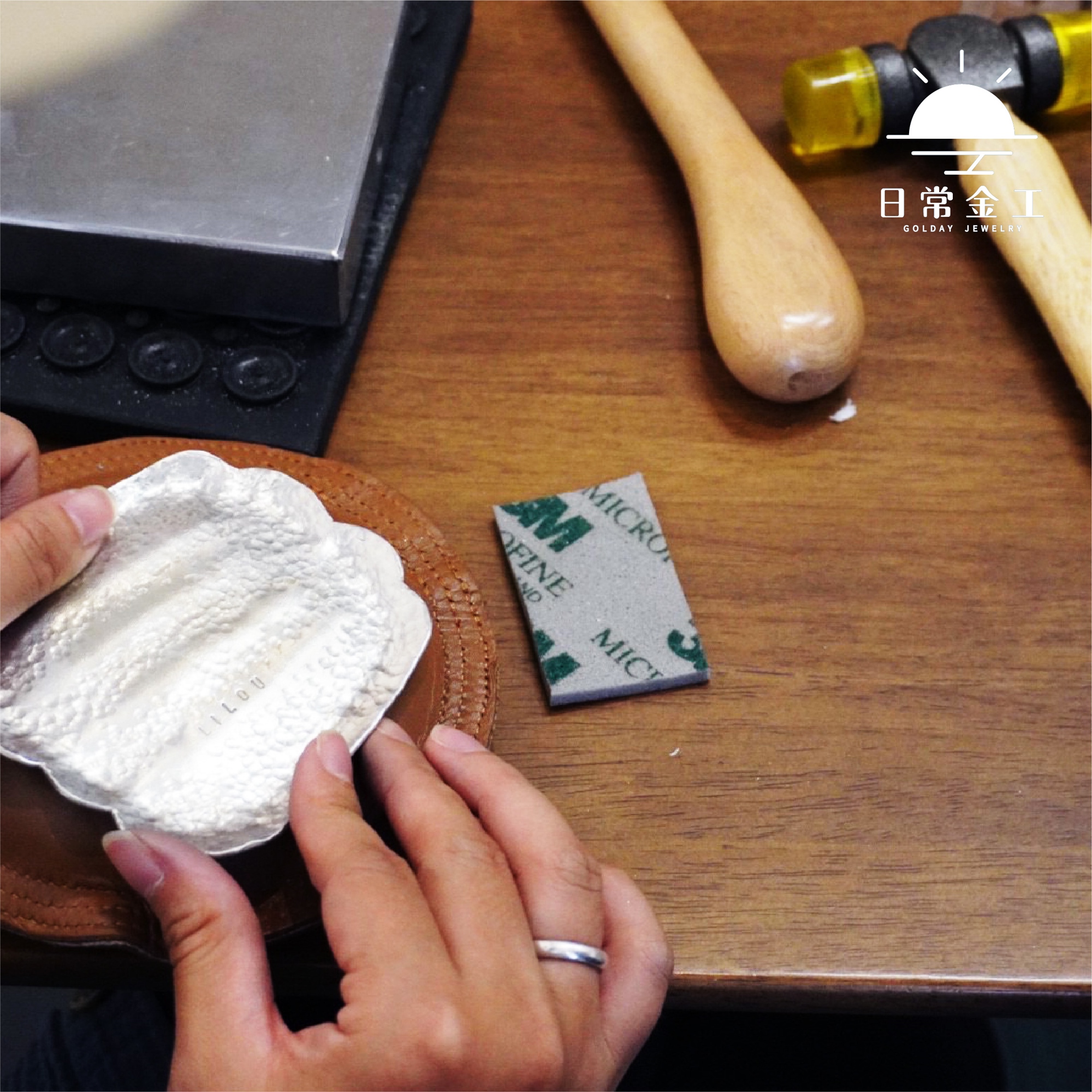 教學如何利用金工槌在飾品上敲出適合的紋理。