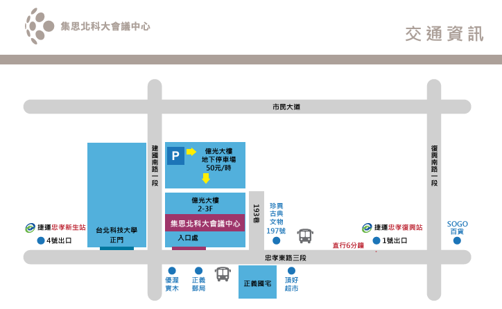 停車:億光地下停車場(電梯直達會議中心):$50元/時,建國南路一段(往建國北方向),過忠孝東路三段即可於右側看見停車場入口