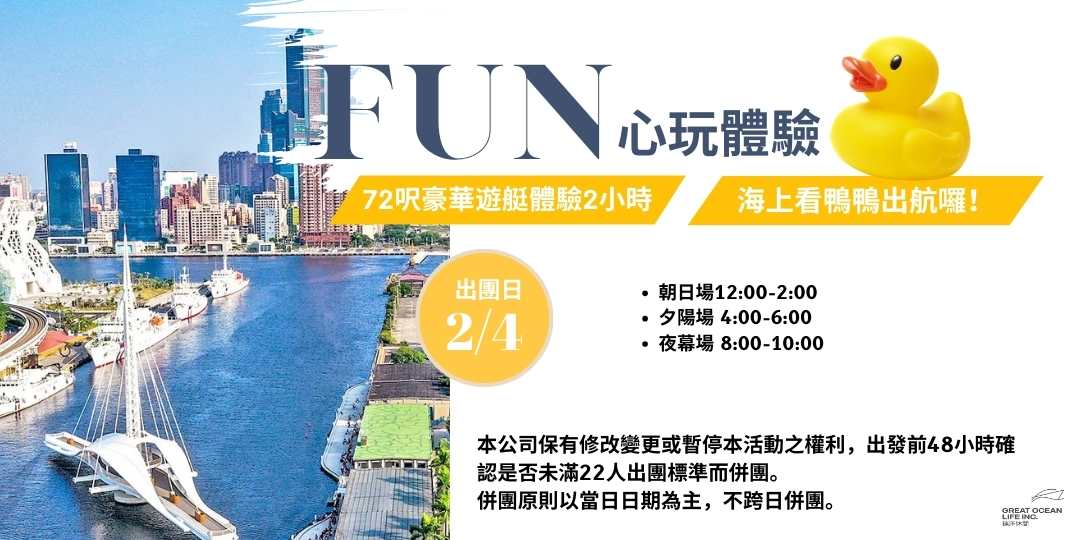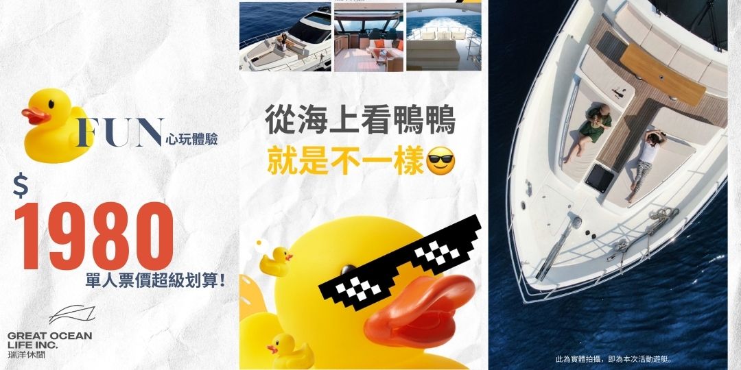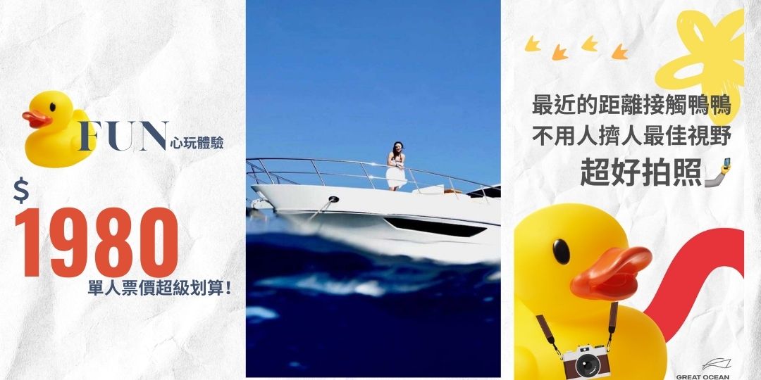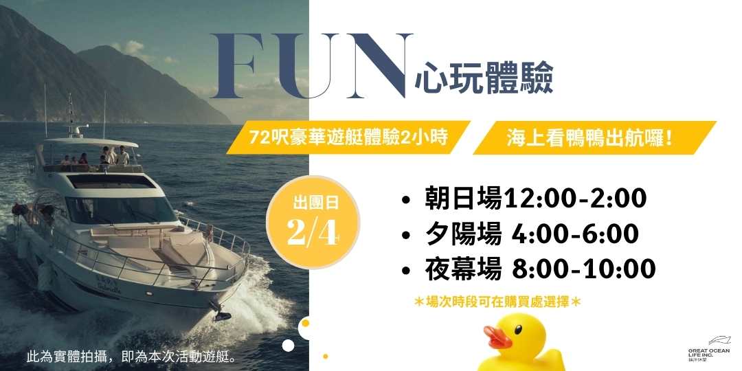 【出發時間2/4】FUN心玩遊艇,黃色小鴨回來啦!登上億元造價的豪華遊艇體驗2小時,鴨鴨零距離自拍好嗨森