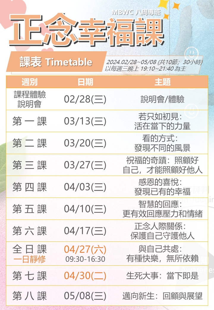 內容:覺察體驗練習60% + 互動共學30% + 主題知識10%