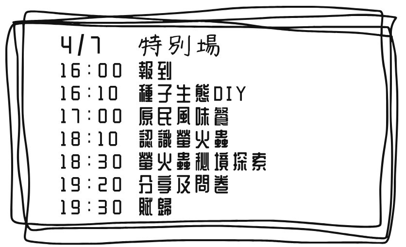 特別場次時間|4月7日 ▲請準時報到,請勿提早到或遲到,謝謝