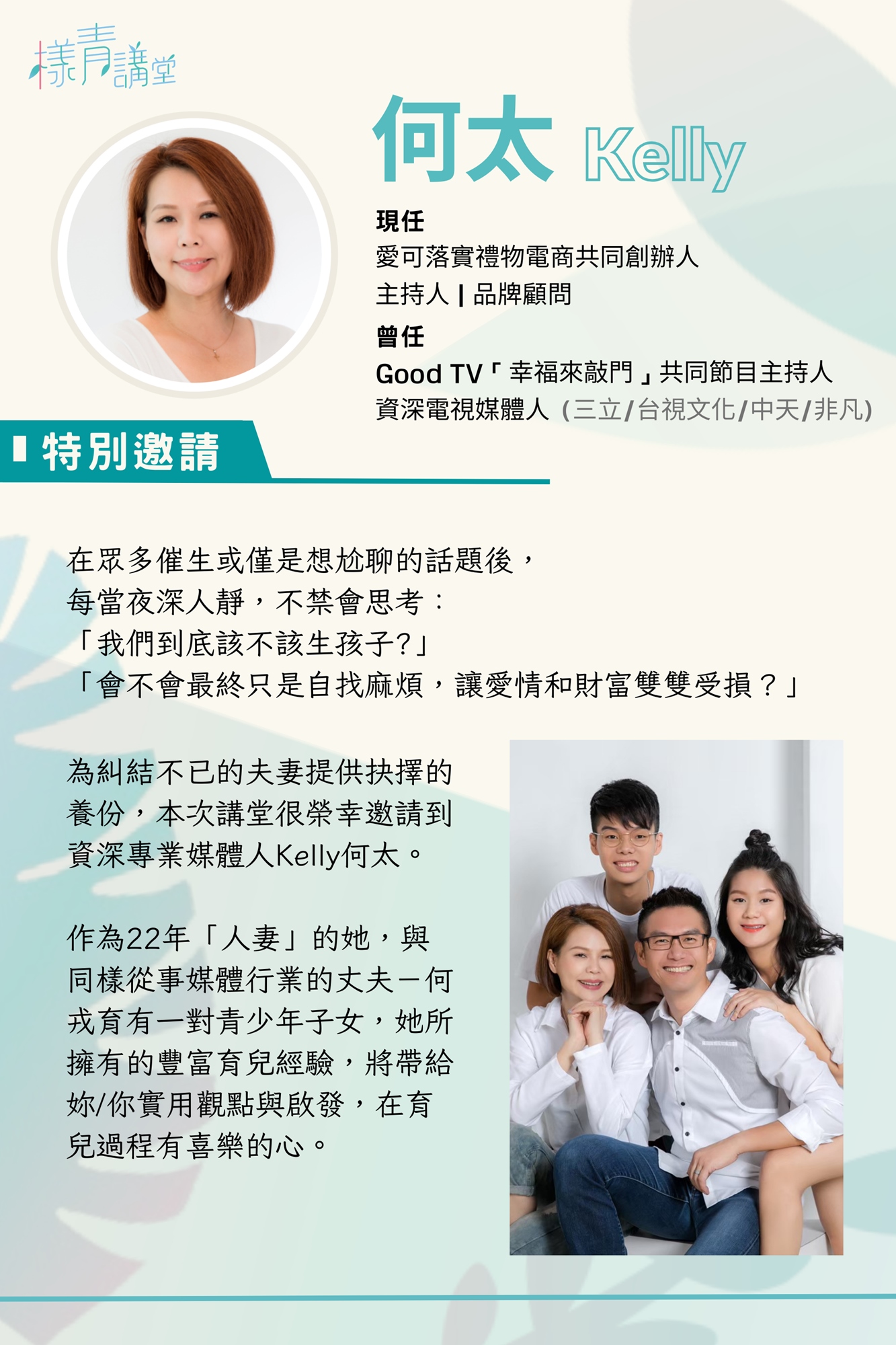 💪歡迎加入我們的講堂,一起探索如何在愛情、事業和育兒之間找到你們的完美平衡點。不論是已經有小孩的夫妻,還是正在糾結的你們,都歡迎來聽聽 Kelly何太 的經驗分享,獲得養份與啟發,過程中都能有喜樂的心,夫妻同心走過這值得的育兒之路 。👫💕