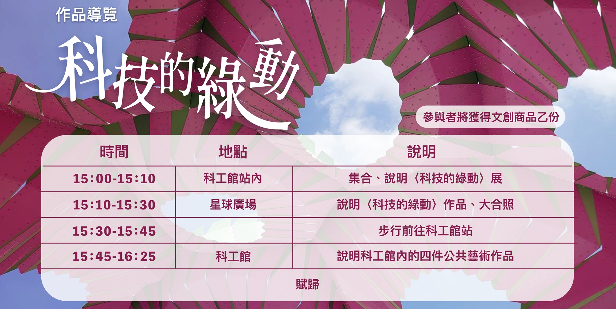蔚龍藝術將於2月25日,在科工館站星球廣場位市民朋友介紹科工館站及科工館的公共藝術,除了介紹作品發想及製作過程,亦想幫助市民朋友認識到平時就在您生活周遭環境的藝術作品。也誠摯地邀請市民朋友們走出戶外,一同到科工館站來散步。