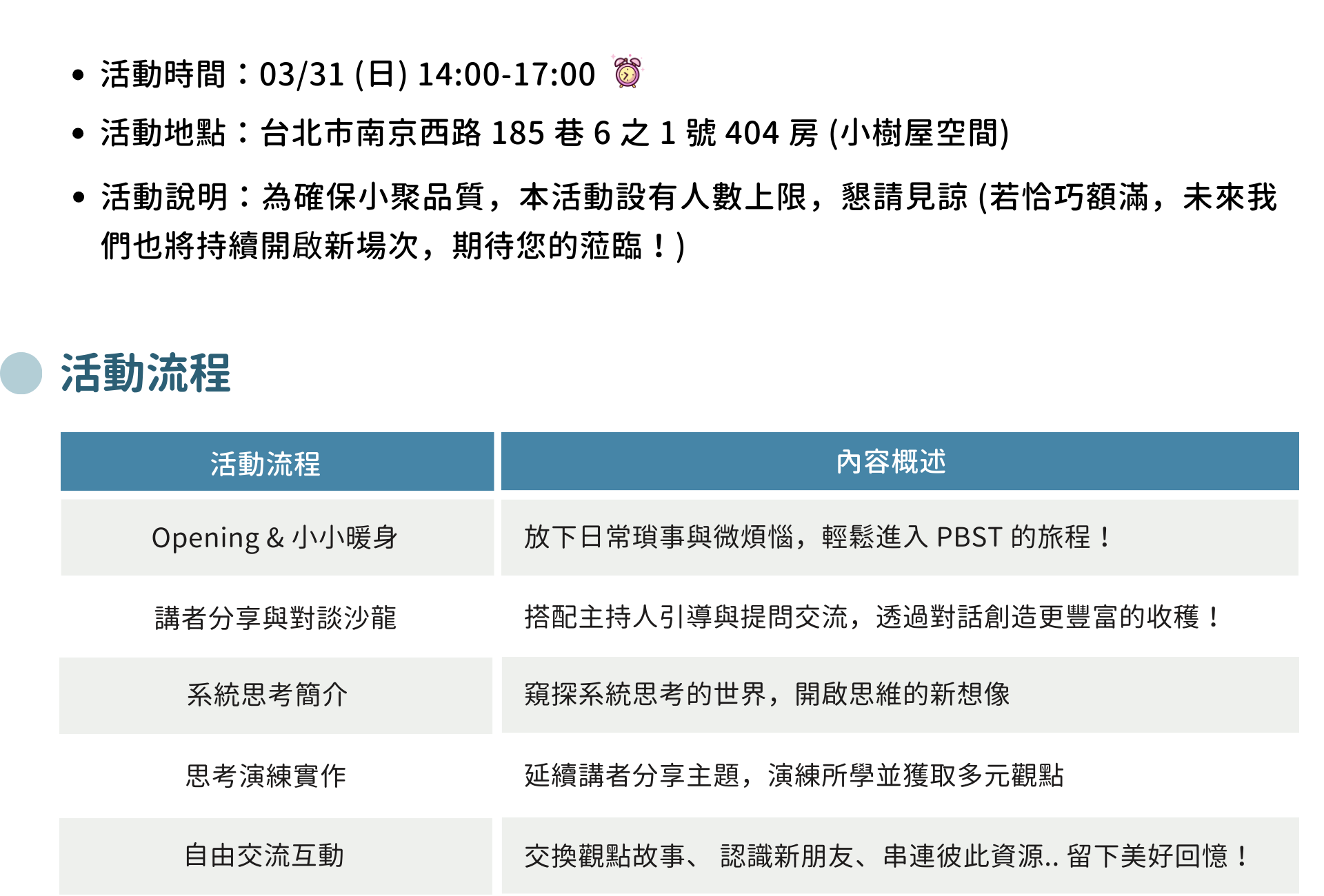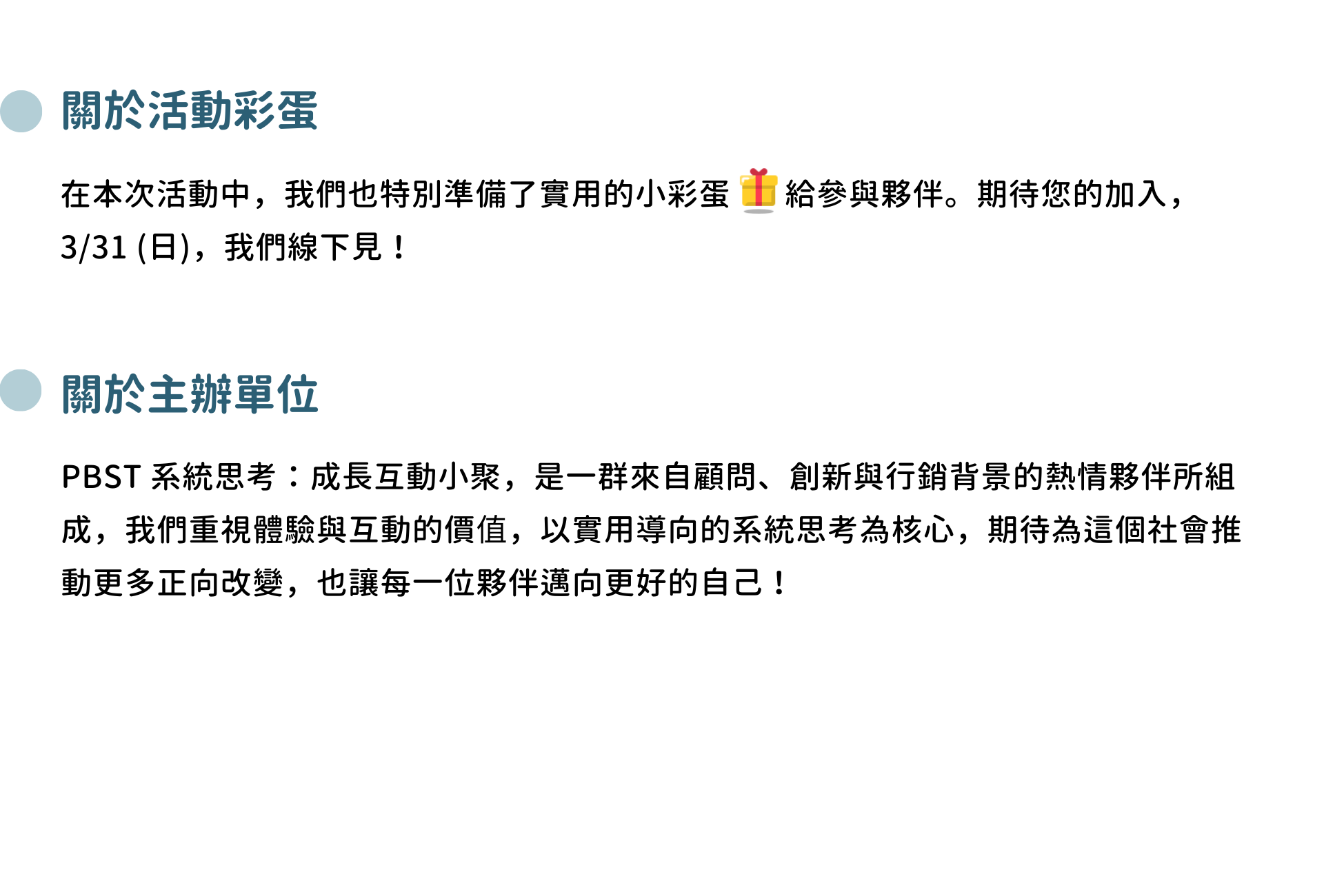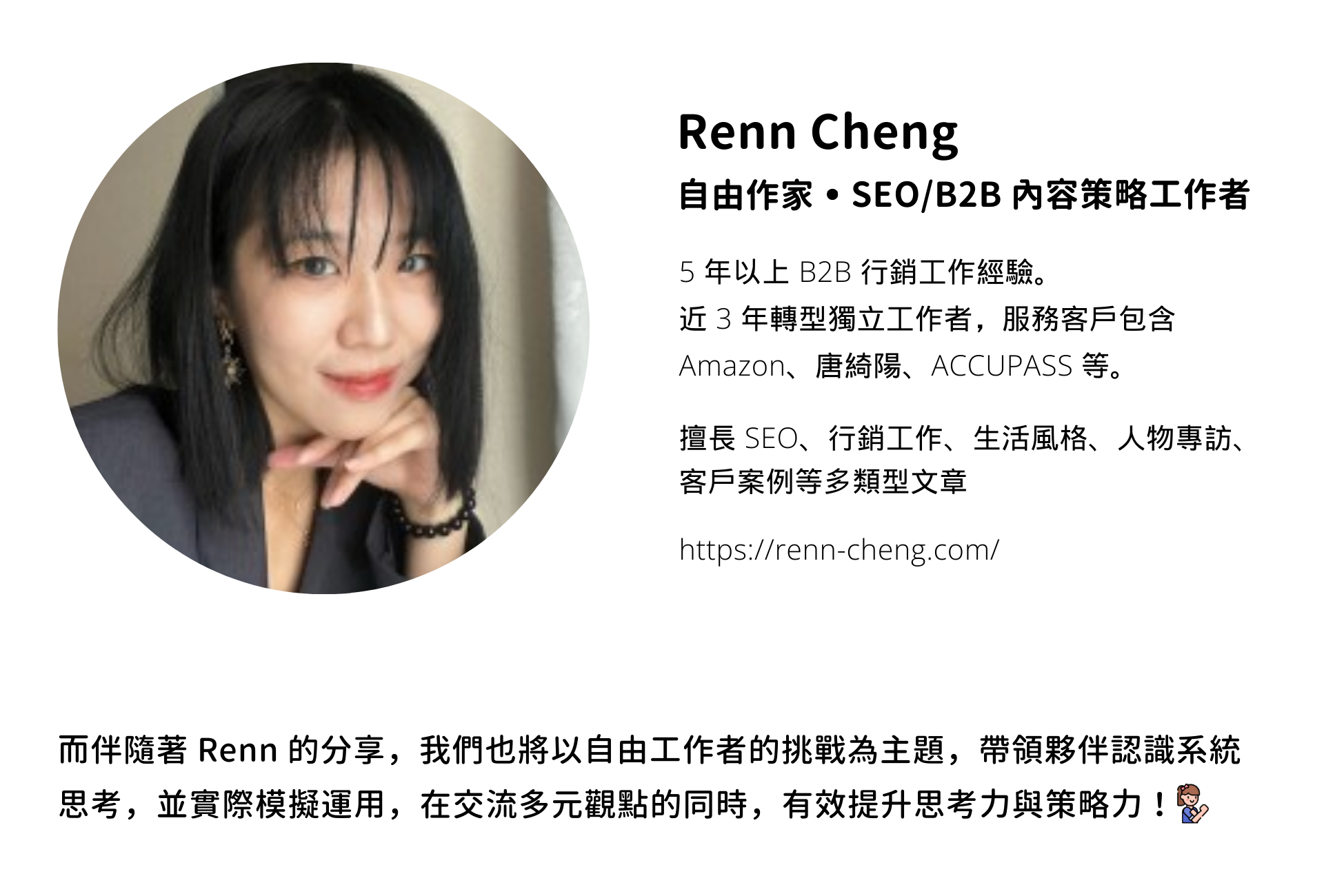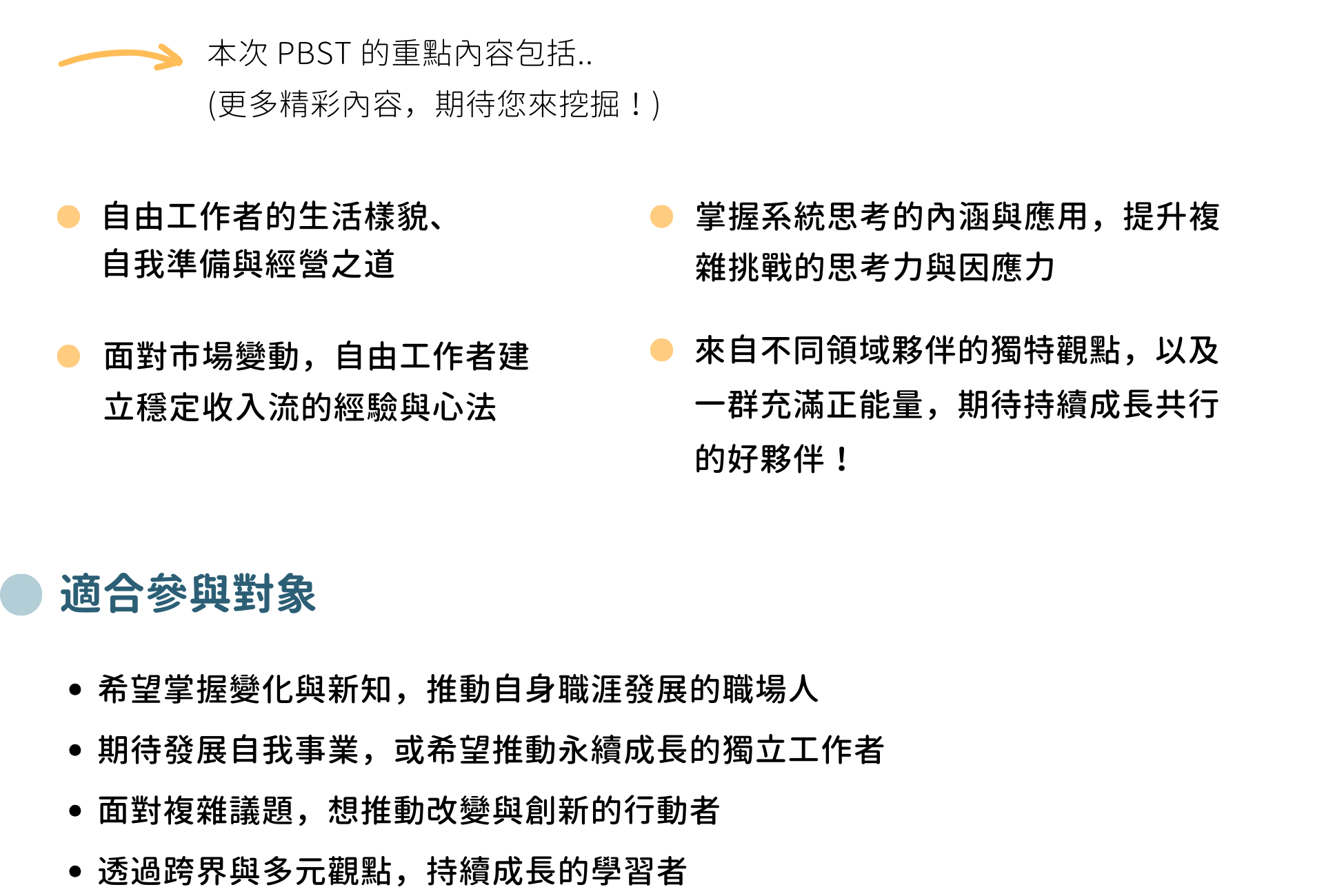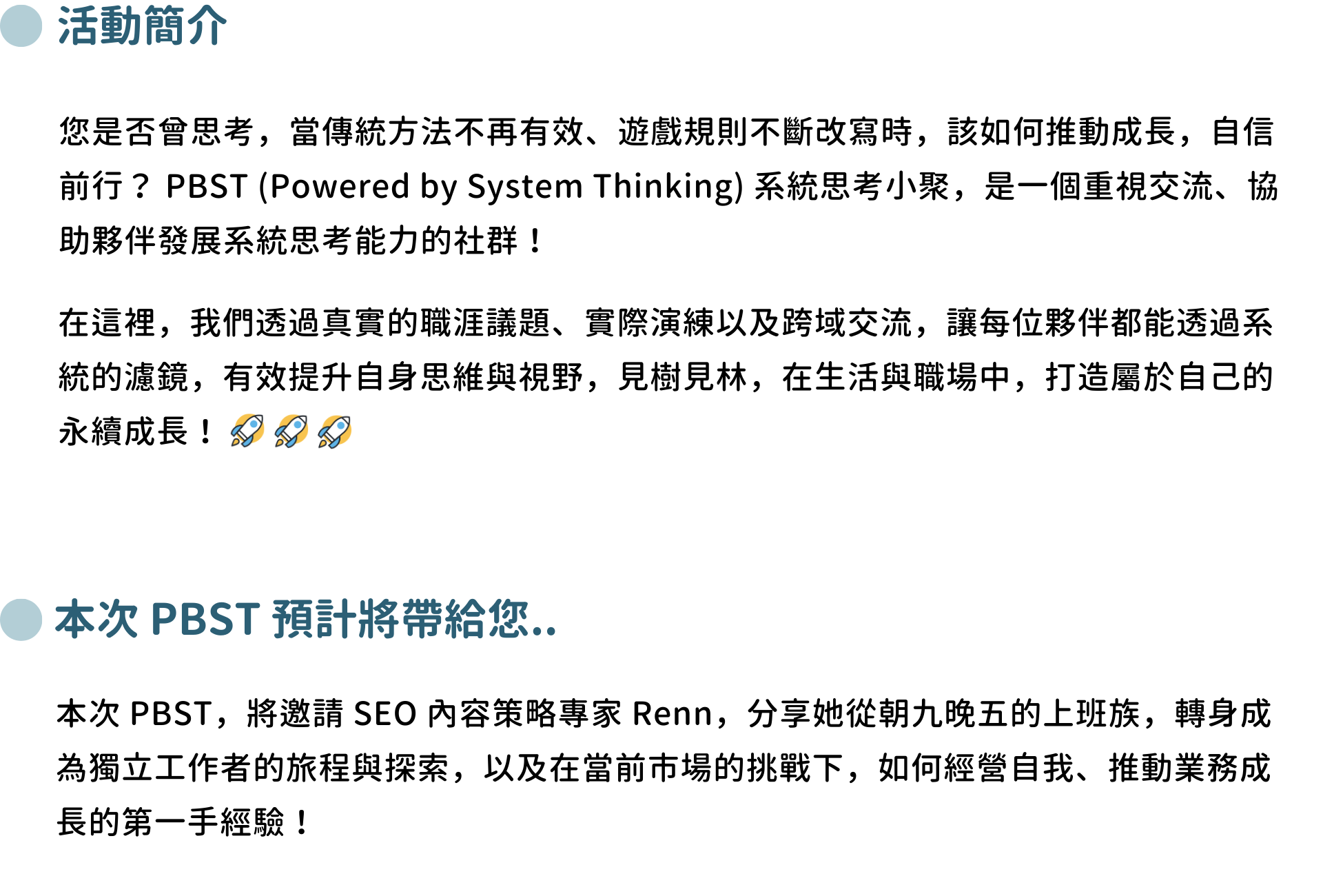 本次 PBST 系統思考小聚,將邀請 SEO 內容策略專家 Renn,分享自由工作者如何在變動市場中,打造穩定收入的心法 💪;同時,現場也將結合系統思考的引導與實作,帶領夥伴探索自由工作的不同可能,在掌握實戰知識的同時,有效提升自己的思考力與策略力!😊