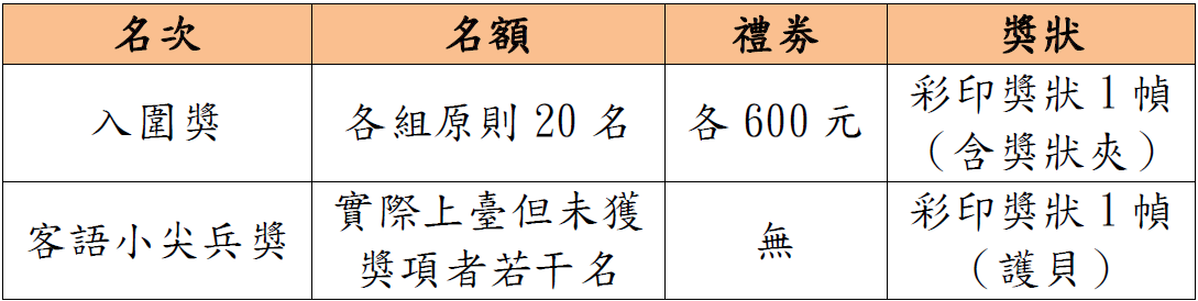 (二)沉浸式客語教學組獎項如下表: