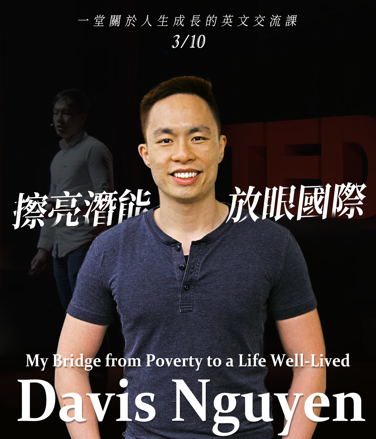 他,靠著學習,同時拿到了哈佛及耶魯大學的入學通知。在2015年自耶魯畢業後除了展開他的管顧創業職涯。他選擇了Toastmasters成為終身學習的管道,除了溝通與領導,來自各行各業的會友更帶給Davis不同的靈感。拜訪體驗各國Toastmasters文化,更成為他獨特接軌國際的方式。曾接受過BBC等國際知名媒體報導,經過11個國家超過200場的演講啟發過無數人,這份感動,即將呈現在你眼前。