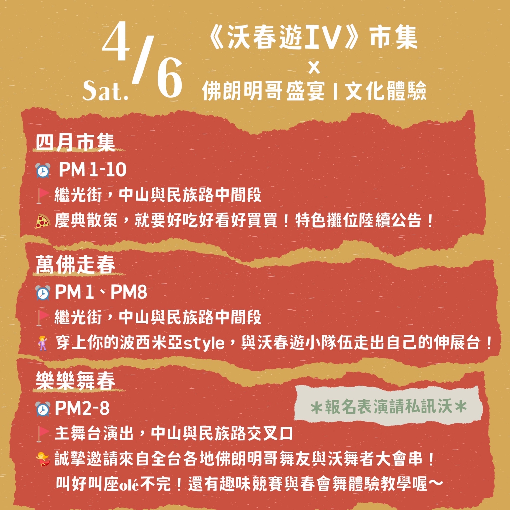 #沃春遊IV 為沃佛朗明哥工作室主辦,並與「南園酒家」&「好民文化行動協會」聯合推出「四月市集」,並共享舞台(4/6沃春遊IV、4/7自由路上藝術節)