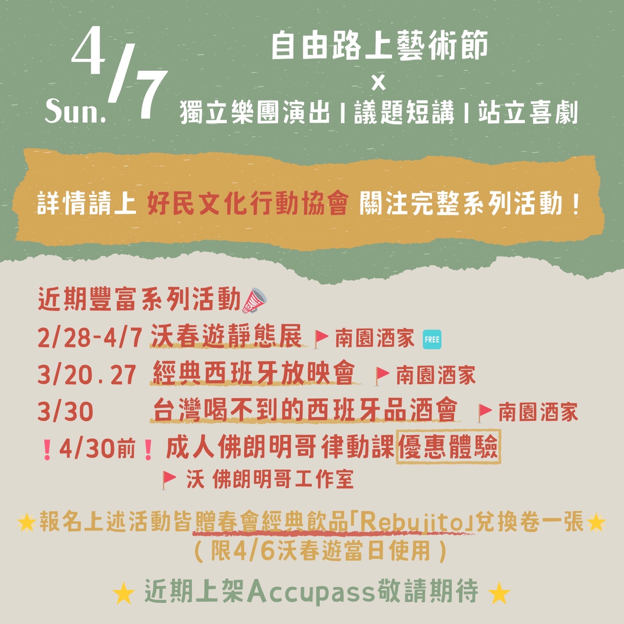🆓 #沃春遊IV 的活動與市集都是免費參加的,我們在ACCUPASS上販售的是「春會特調Rebujito」的優惠卷(現場$200/杯,預購$100/杯),但!凡報名 #沃春遊IV 相關系列活動都能獲得「春會特調Rebujito」的免費兌換卷,參與演出的表演者也是喔🌹