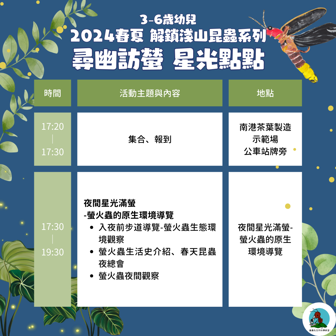 我們將帶著小朋友夜間賞螢,在欣賞到螢火蟲美麗的點點星火的同時,