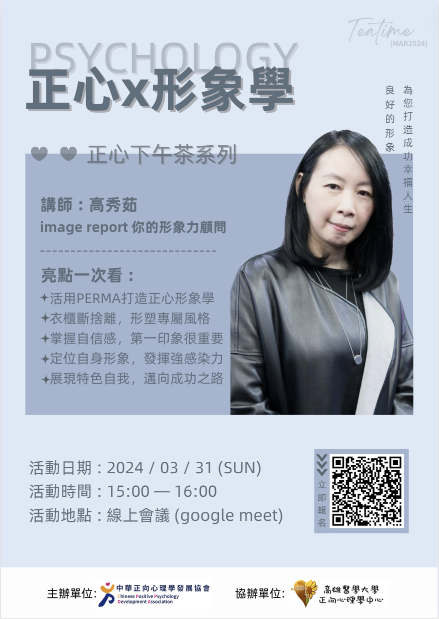 正心下午茶為中華正心協會為推廣正向心理學所做的活動~每個月固定推出一次,講座時長為一個小時,費用為完全免費!在2024年三月,我們邀請了專業形象顧問高秀茹蒞臨講堂!帶你建立個人形象風格,打造強大自信與魅力🌼