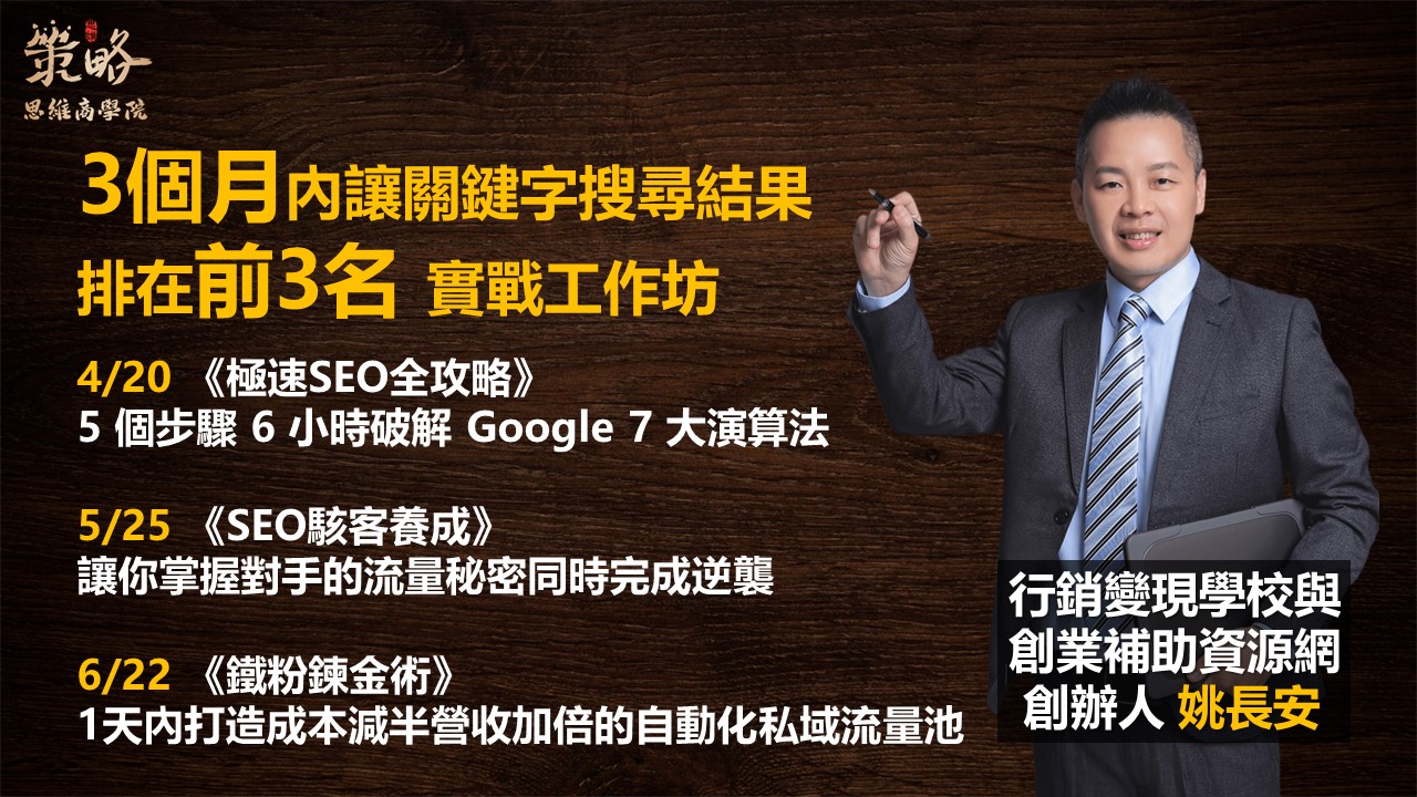 每個企業或商家都想要以最少的成本,獲取最大的營收。為了讓你從「曝光」到「訂單」這條路走的更順,我們舉辦一個【3個月內讓關鍵字搜尋結果,排在前3名實戰工作坊】系列課程。這不僅是一個目標,更是一項實戰挑戰,你將帶著勇氣和決心,一同踏上這段充滿挑戰但絕對值得的旅程。