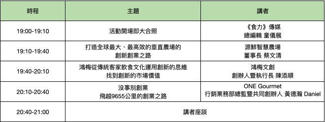 邀請 「源鮮智慧農場」創辦人蔡文清、「鴻梅文創」創辦人陳添順、「ONE Gourmet 」共同創辦人 黃德瀚 Daniel 用不同元素,打破飲食創業的固有思維!