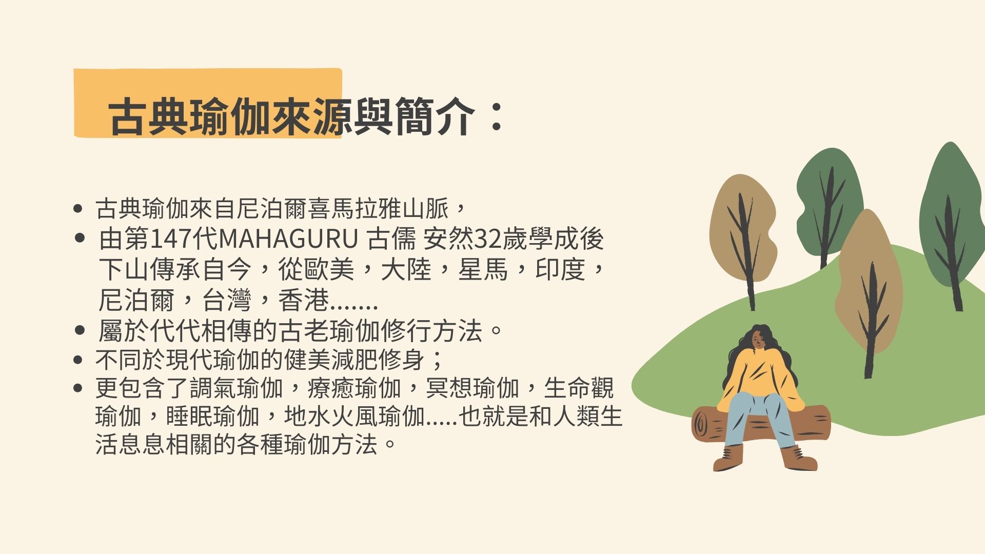 古典瑜伽來自尼泊爾喜馬拉雅山脈,由第147代MAHAGURU 古儒 安然32歲學成後下山傳承自今,從歐美,大陸,星馬,印度尼泊爾,台灣,香港....... 屬於代代相傳的古老瑜伽修行方法。不同於現代瑜伽的健美減肥修身;正式的古典瑜伽課程(由MAHAGURU 古儒 安然親授)更包含了調氣瑜伽,療癒瑜伽,冥想瑜伽,生命觀瑜伽,睡眠瑜伽,地水火風瑜伽.....也就是和人類生活息息相關的各種瑜伽方法。