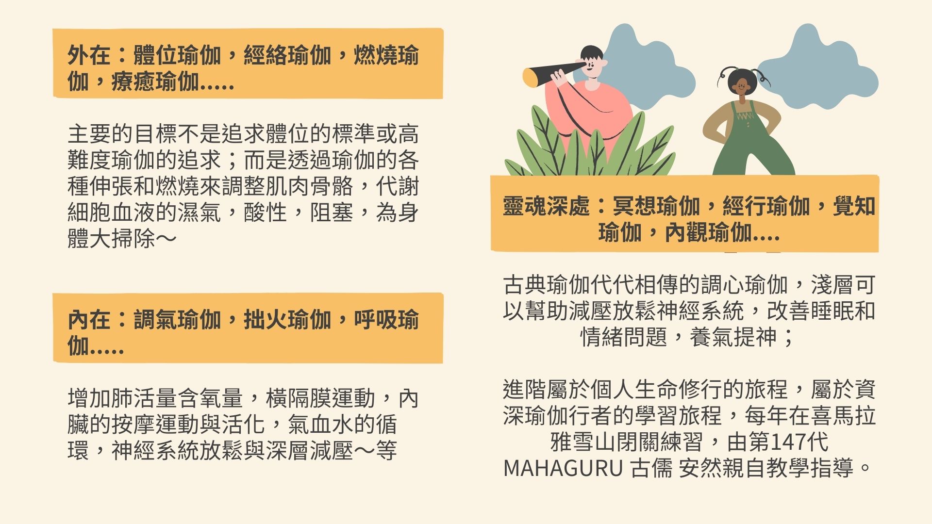 如果你在尋找一個完整的身心靈平衡方法,能夠縱含到身體細胞的代謝,氣血水的循環,肌耐力與肌肉力量提升,骨骼與筋絡的調整,呼吸與肺活量的訓練,內臟的運動,橫隔膜呼吸與自律神經系統的平衡,同時對如何呼吸放鬆,幫助身心緊繃能量平衡與舒壓有需求,新的一年,邀請你成為古典瑜伽“瑜伽行者”,成為一個更完整健康平衡自在的你!
