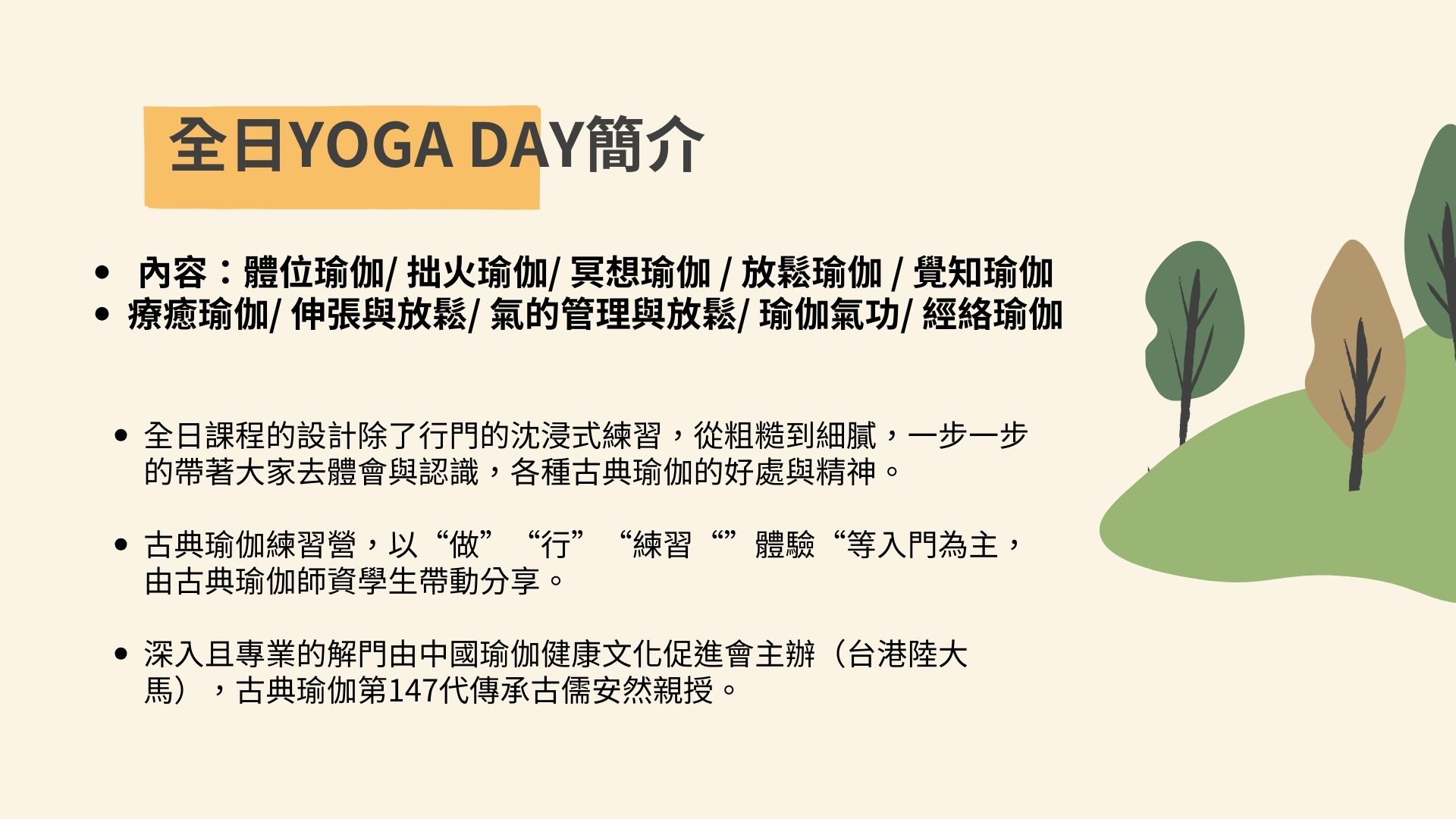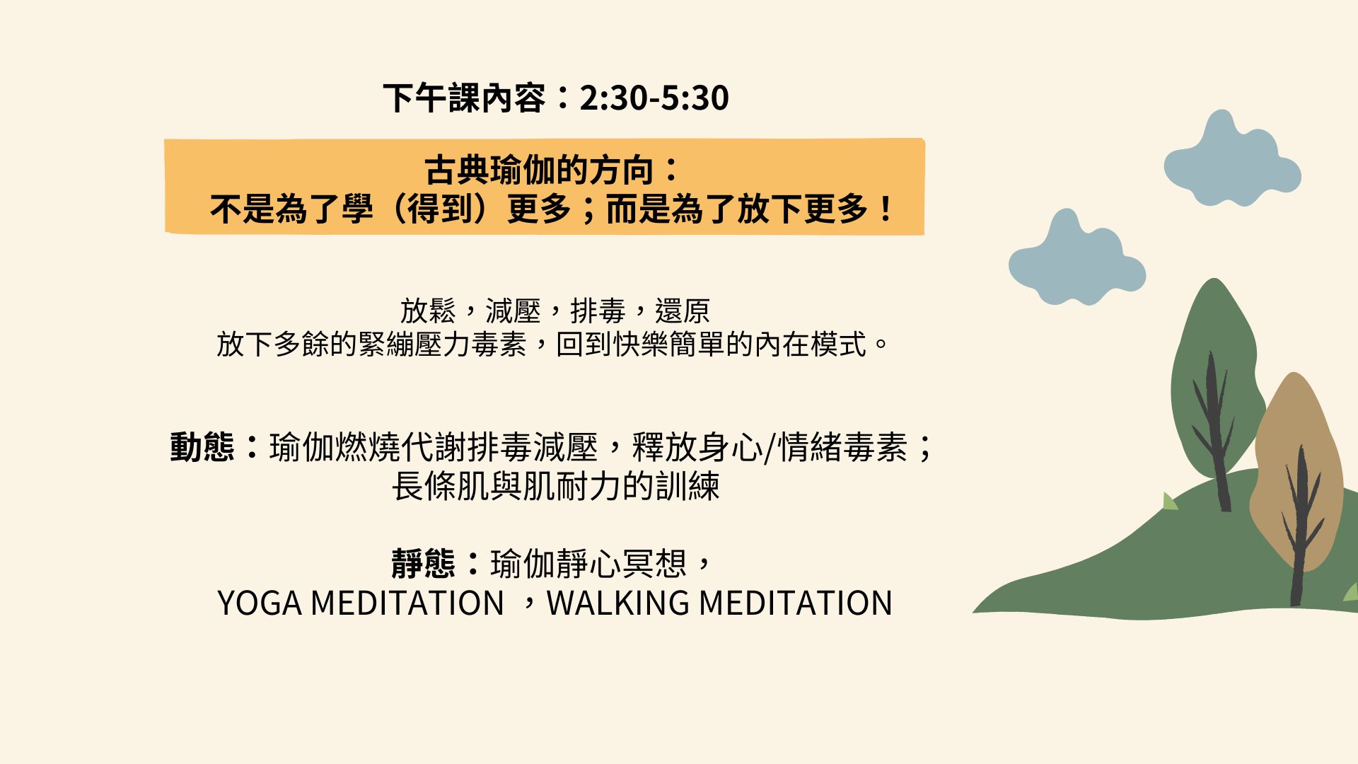 瑜伽營一動一靜,補氣排毒,放鬆身心,課後建議多預留半個小時讓身心大休息後,甚至補充一點能量蔬菜湯後,幸福感充滿後再回家吧!