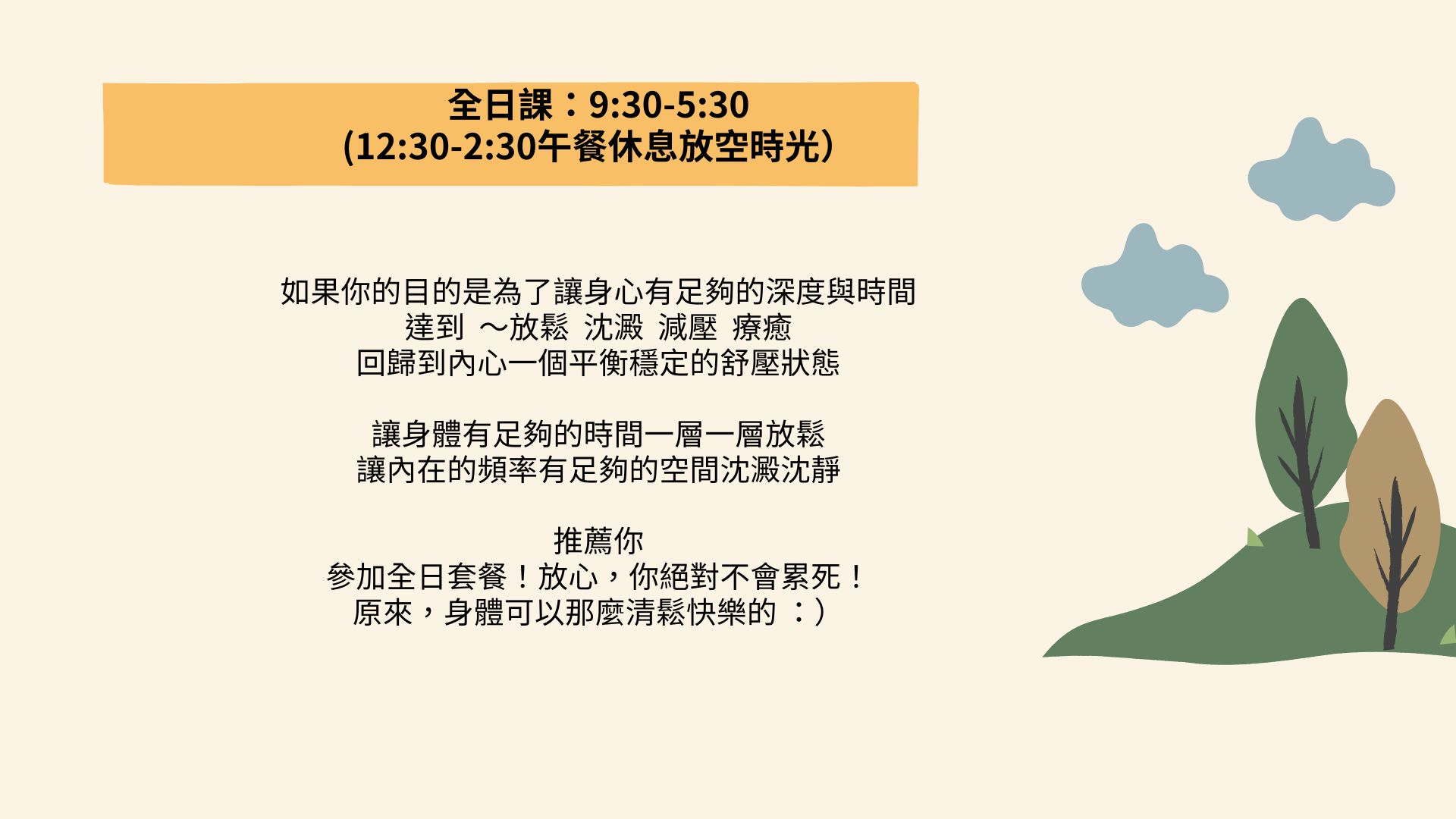 全日沈浸式體驗,是一個很棒的開始!如果你的目的是為了讓身心有足夠的練習深度與時間達到 ~ 放鬆 沈澱 減壓 療癒;回歸到內心一個平衡穩定的舒壓狀態,讓身體有足夠的時間一層一層放鬆;讓內在的頻率有足夠的空間沈澱充電,推薦你參加全日營,一點一滴的善待身體!愛自己!