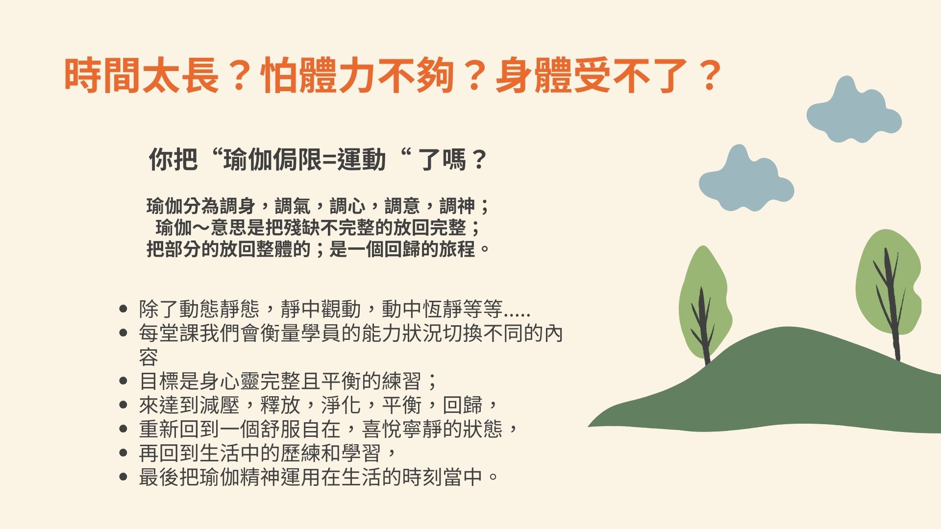 好好的透過瑜伽,享受一個不一樣卻又平凡無比的時光。