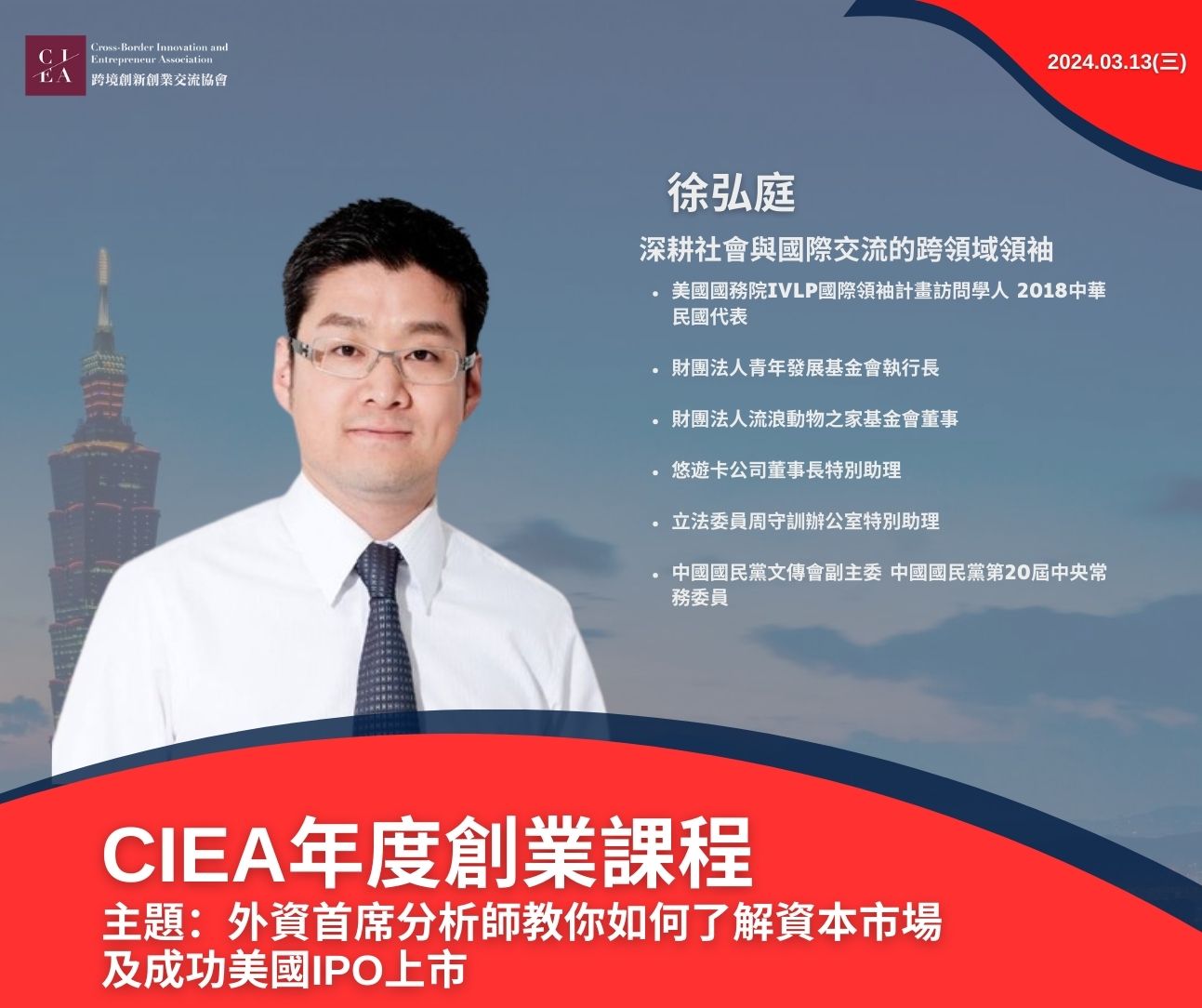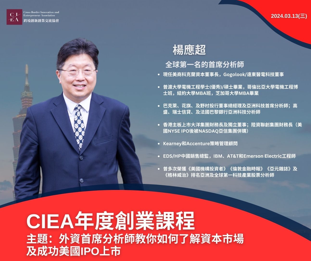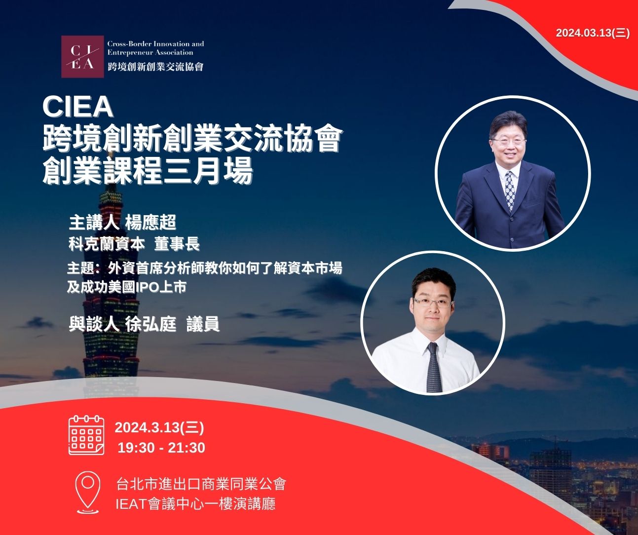 本堂課 將由 科克蘭資本 楊應超 董事長 分享 教你如何說資本市場的話,認識美國市場IPO,成功上市,並由 徐弘庭 議員 與談。