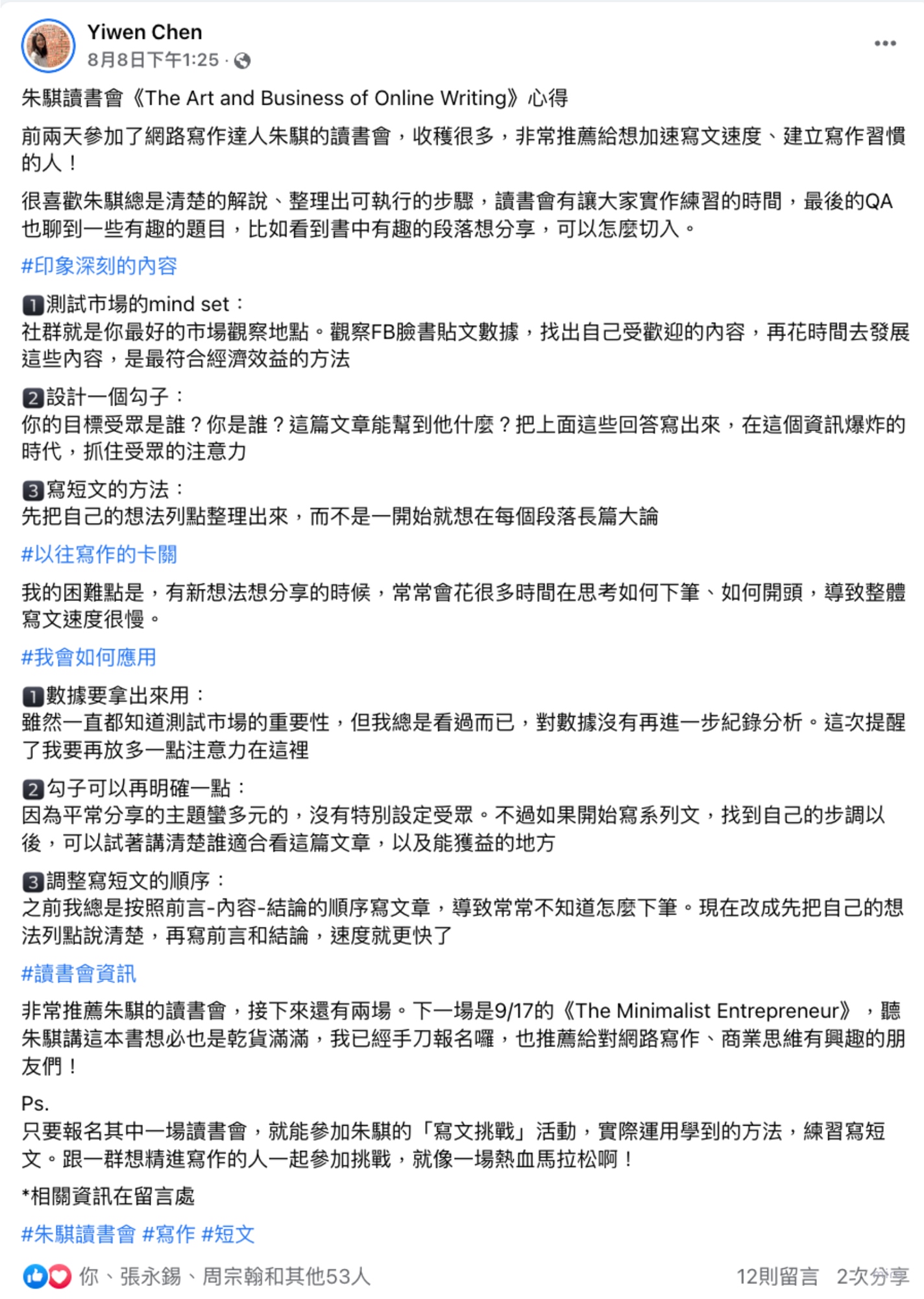這堂課程最早是在 2023 朱騏讀書會《The Art and Business of Online Writing》的教學內容,下方為當時學員對這堂讀書會的課後回饋。