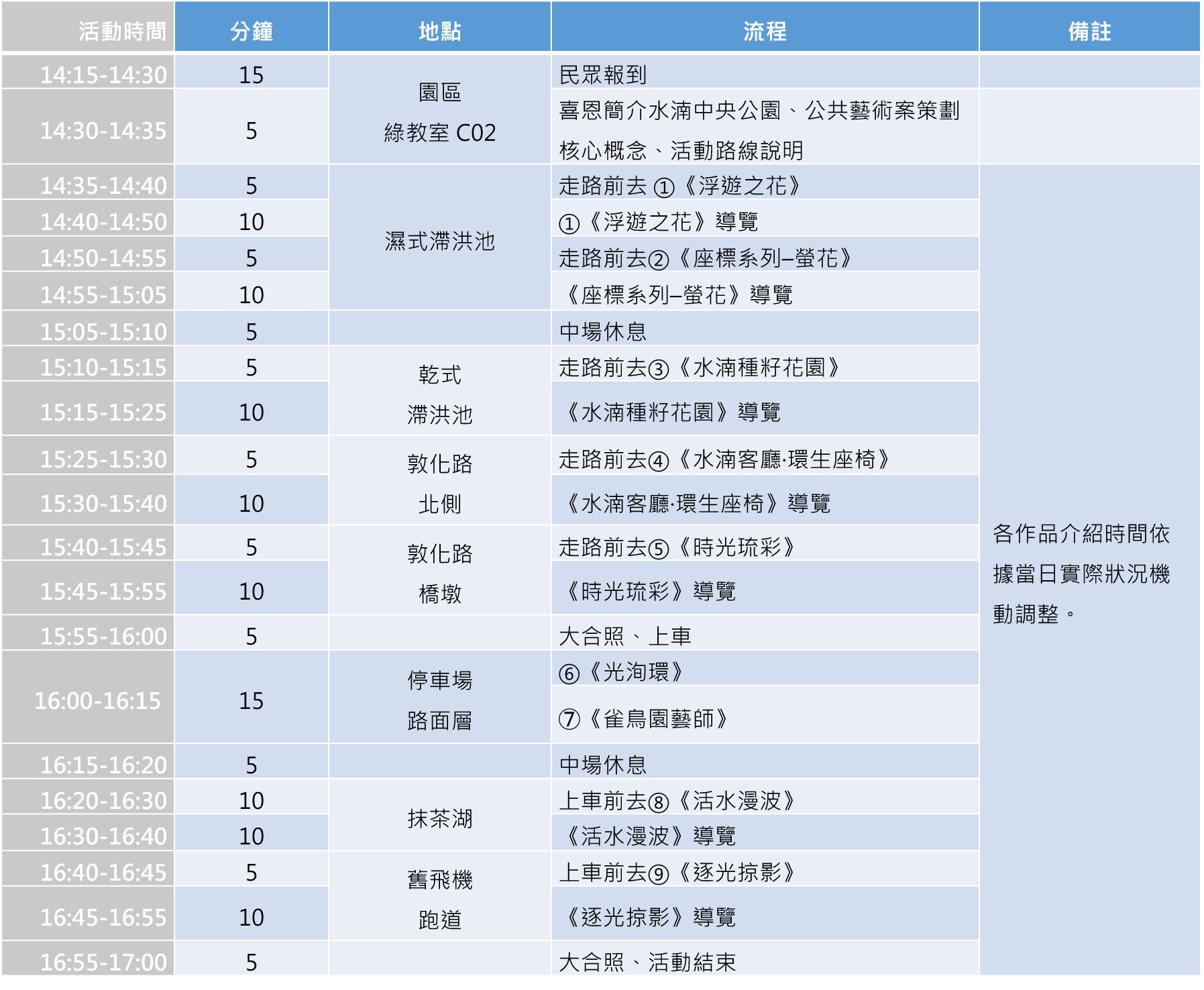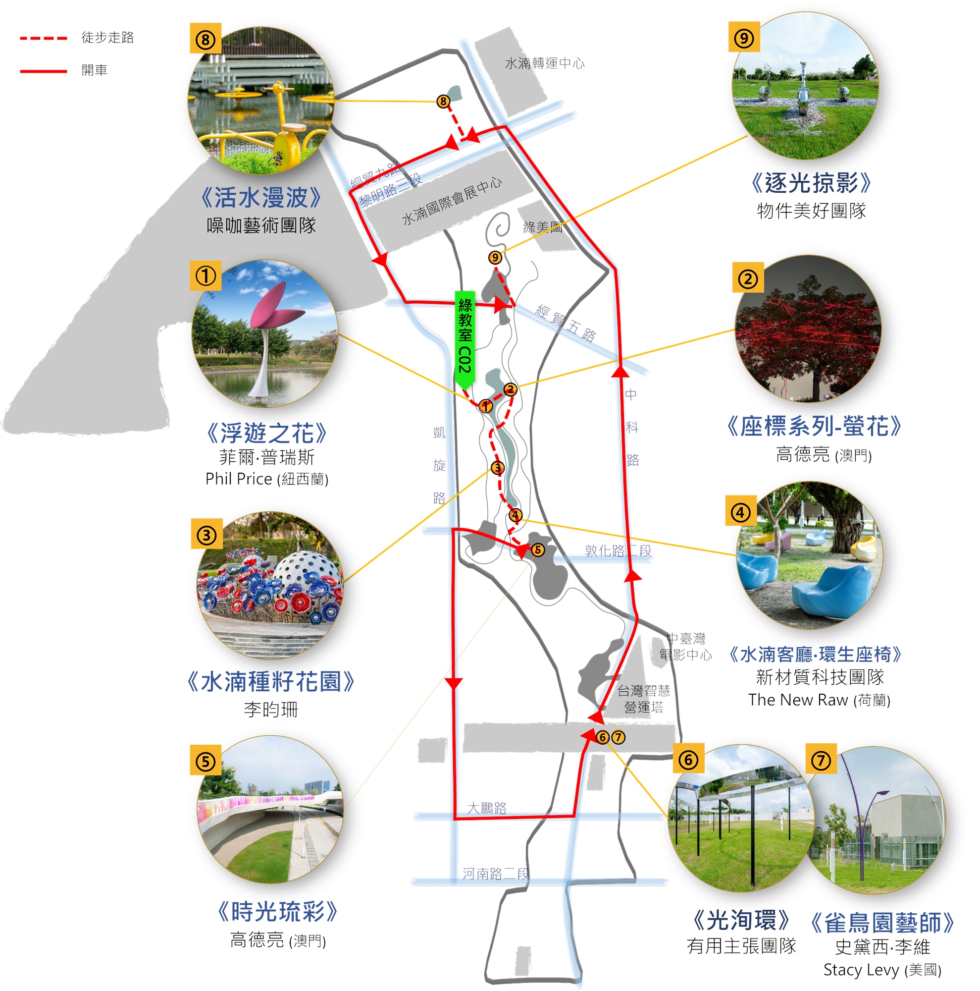公共藝術作品配置總共分成北、中、南三區。包括北區由噪咖藝術團隊創作的《活水漫波》,設置於水湳轉運中心附近,抹茶湖邊之綠地。以及物件美好團隊所創作的《逐光掠影》,呼應原飛機跑道舊址。中區包含藝術家高德亮的《座標系列-螢花》與《時光琉彩》;紐西蘭藝術家菲爾·普瑞斯(Phil Price)的《浮遊之花》;李昀珊所創作,位於大片調節池的作品《水湳種籽花園》;以及荷蘭新創藝術團隊 新材質科技團隊(The New Raw)的《水湳客廳∙環生座椅》。南區停車場出入口所圍繞的綠地,也是櫻花遍植的所在,設置藝術團隊有用主張工作室創作的《光循環》。一旁還有美國藝術家史黛西·李維 (Stacy Levy)女士創作的《雀鳥園藝師》。