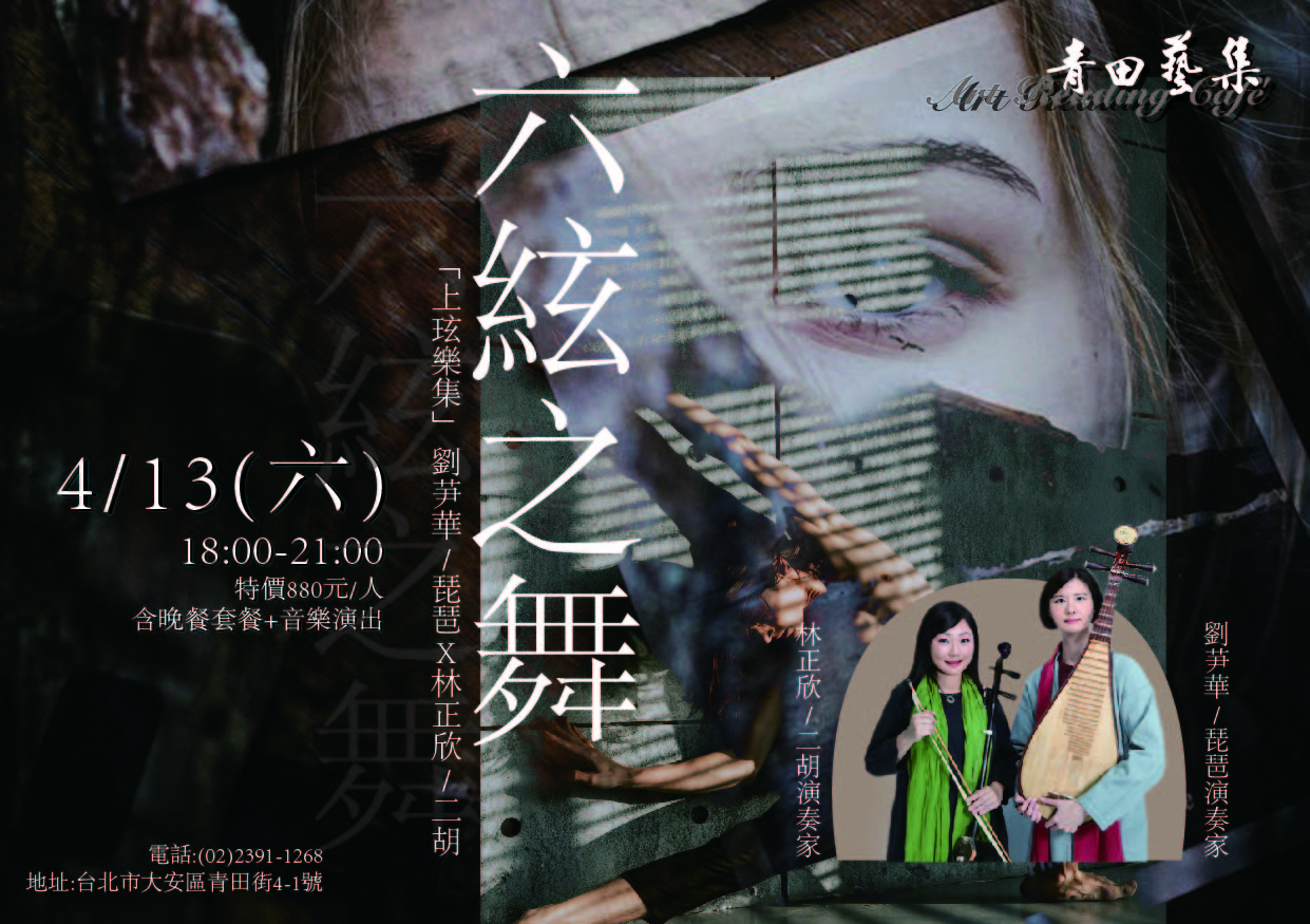 中國傳統樂器最具代表性的其中兩樣就是琵琶與二胡,琵琶四條弦,二胡兩條弦,加起來剛好就是六條弦,簡單的音符化為時而簡樸時而華麗的樂音,在六條弦之間飛舞,並相互融合、呼應交織著,便成就了本場音樂美食夜的主題~「六弦之舞」。
