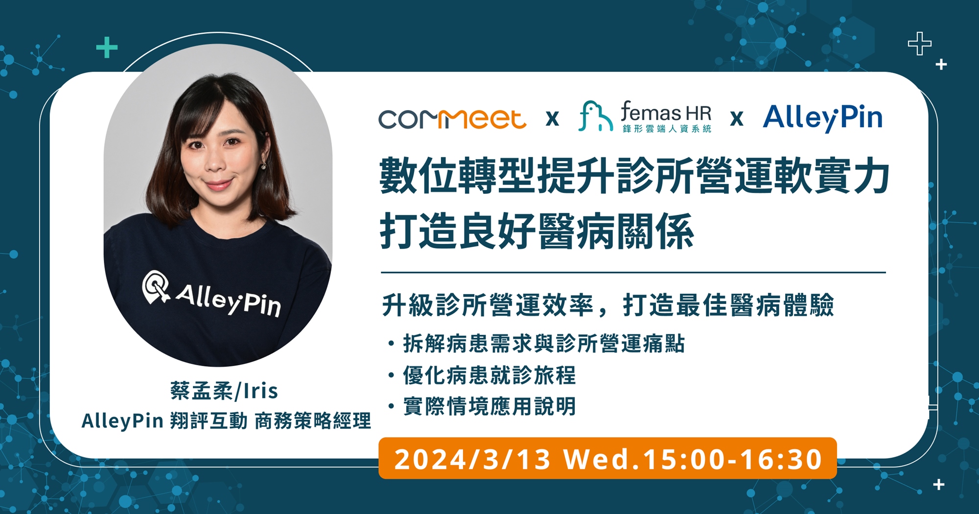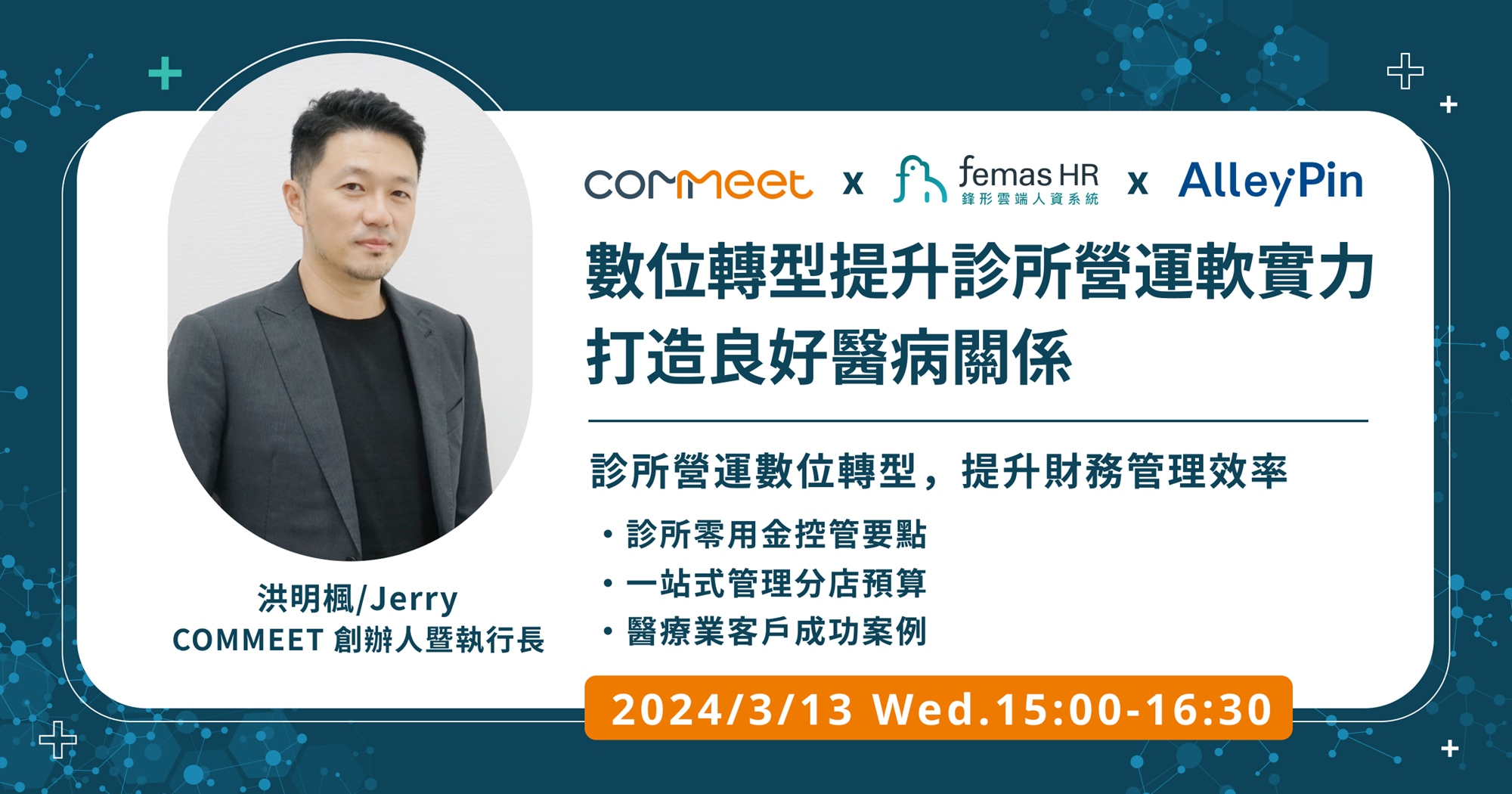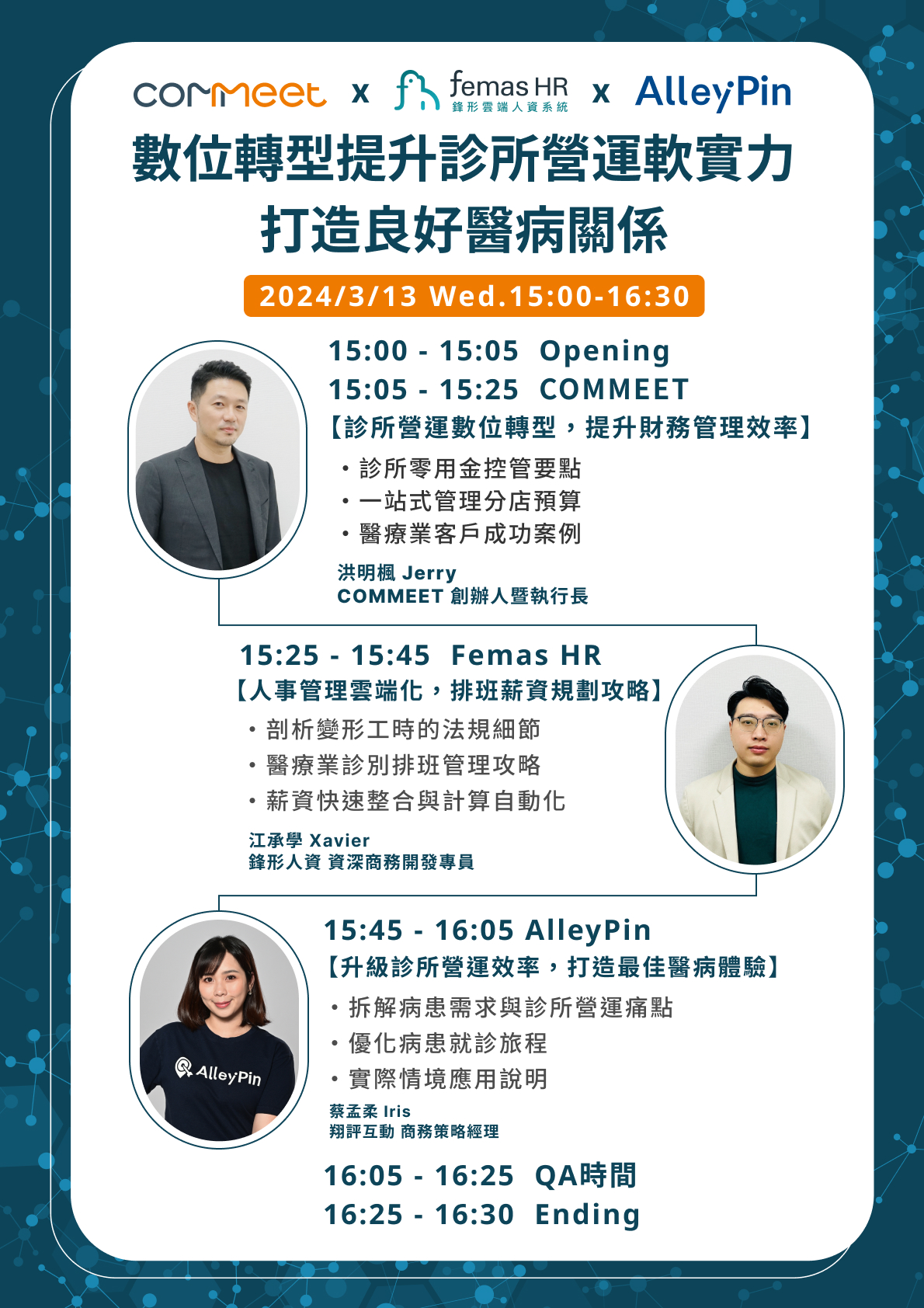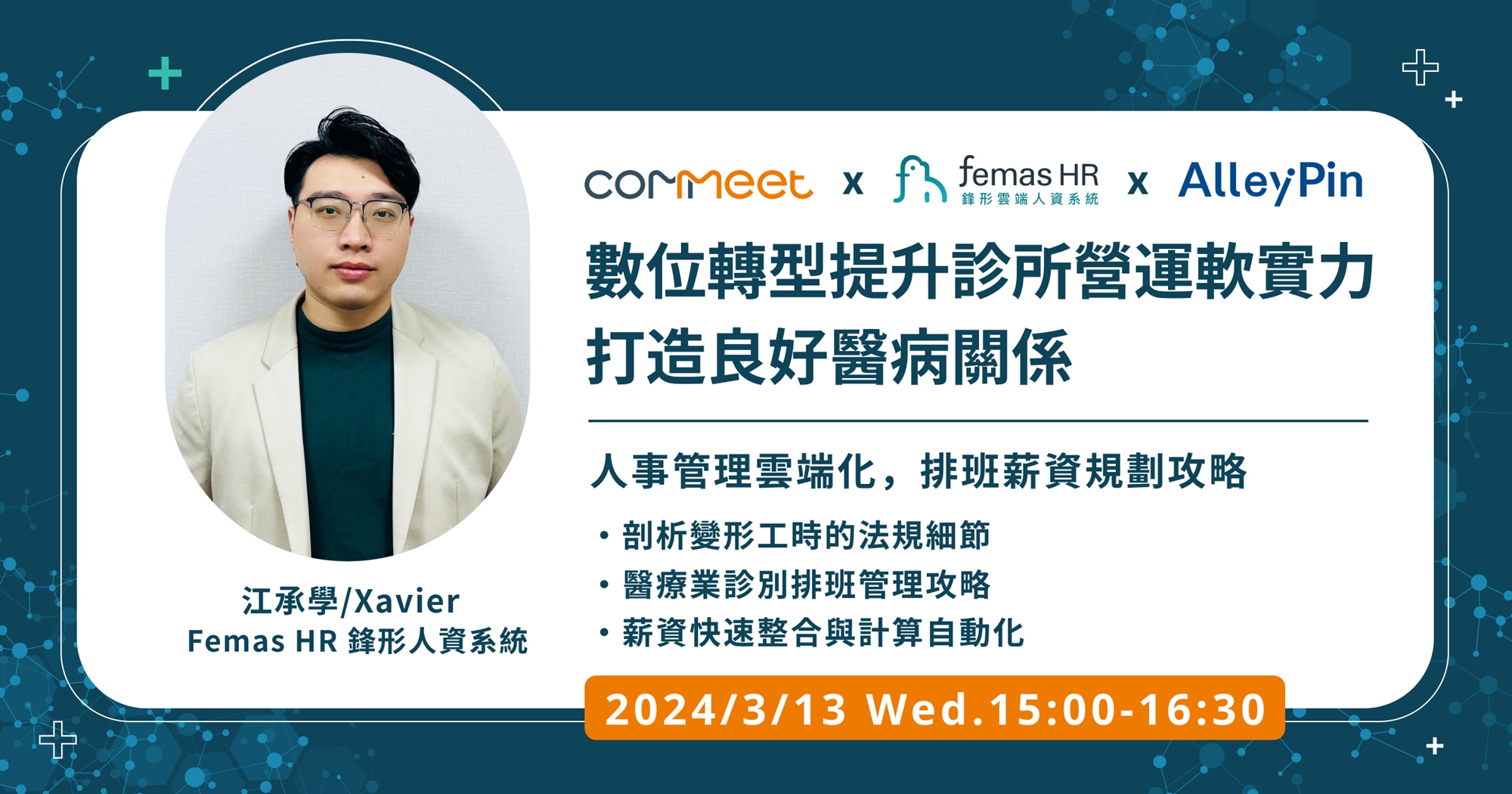 另外也特別邀請到 COMMEET 合作夥伴 Femas HR 鋒形人資系統,來分享診所在差勤管理上有哪些細節需要留意、正職人員及輪班人員班表排定又有哪些秘訣,透過系統自動化計算薪資,省時省力達成人事管理。