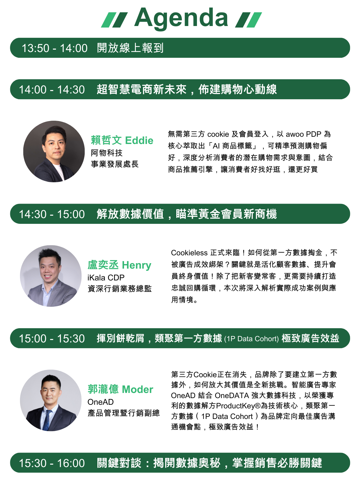 Google 宣布 2024 年第一季開始 cookie 階段性退場,全球至少 3000萬個用戶受到影響,而第三季更是全面逐步停止支援。面對 cookieless 的危機浪潮,以及廣告成本逐步攀升的雙重夾擊之下,品牌該如何應對?本場講座將分享,透過 MarTech 工具整合多元管道顧客數據,建構品牌自有的第一方會員資料庫,打造廣告創意與數據變現策略,並運用 AI 精準掌握消費意圖、佈建電商站內最佳購物動線,讓品牌能全盤掌握消費者與商品銷售的黃金量能!