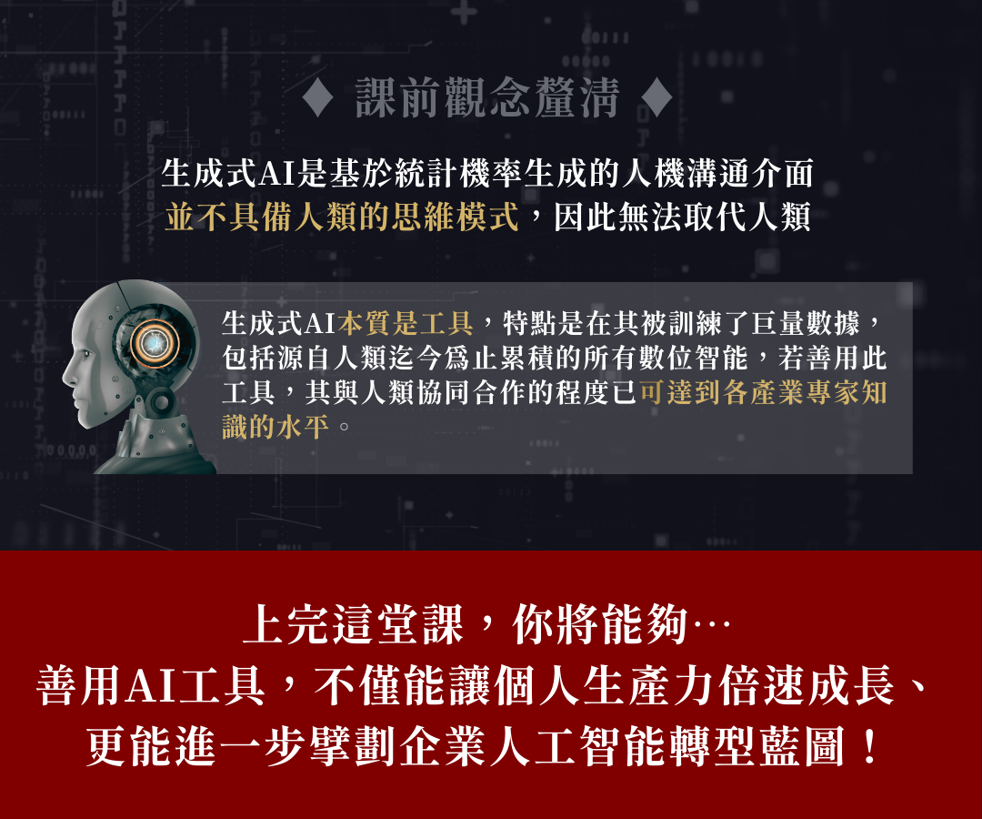 - 認識生成式AI與AI轉型,深入理解當前技術的發展及其對商業的影響,以利部門、企業擘劃AI轉型藍圖