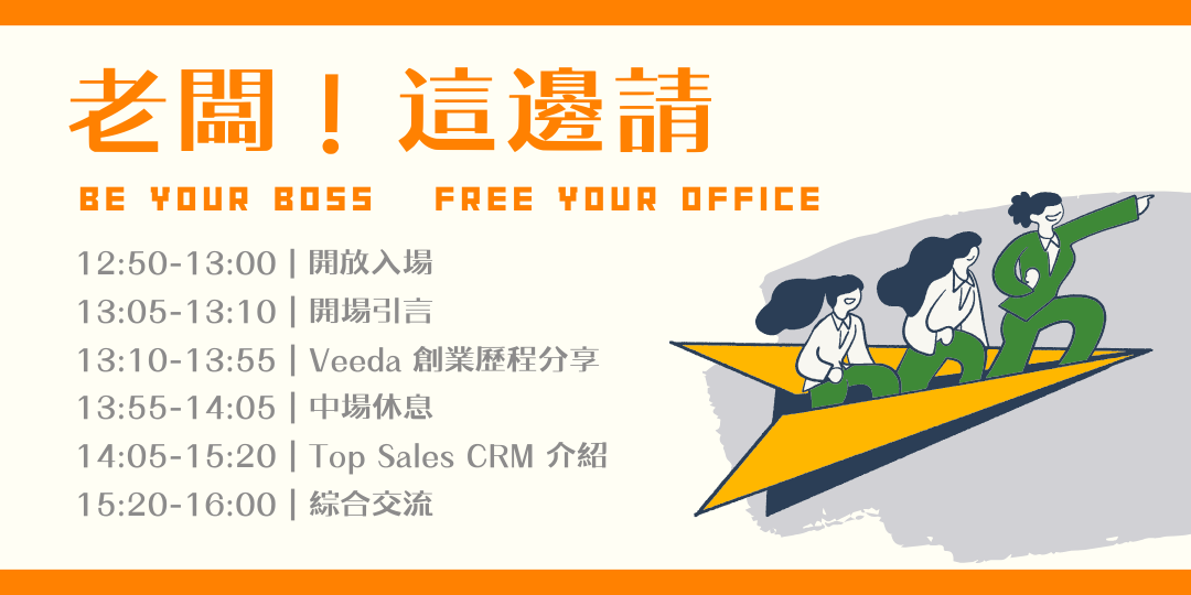 本活動透過創業家的經驗分享交流,幫助準創業家、投入自由工作者更深入理解過程中可能遇到的挑戰,並提供實用的建議和指導。講座中也將結合Top Sales CRM系統的輔助,帶領與會者重建人生職涯藍圖、導入自律人生,帶領你一步步從心靈自由到財富自由的自由人生!