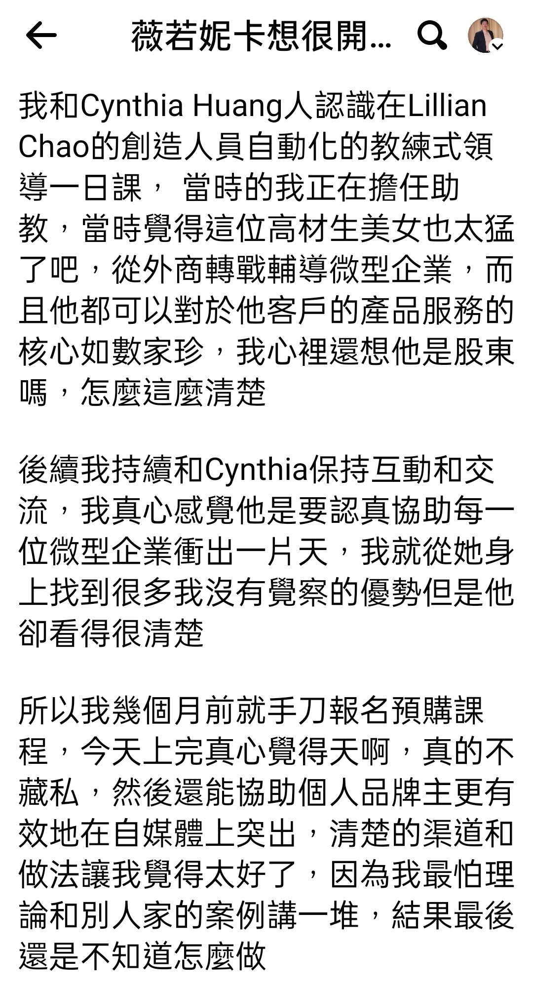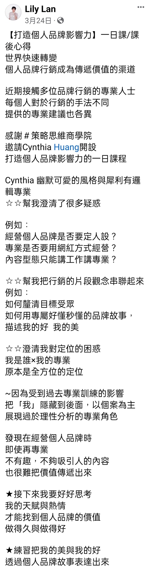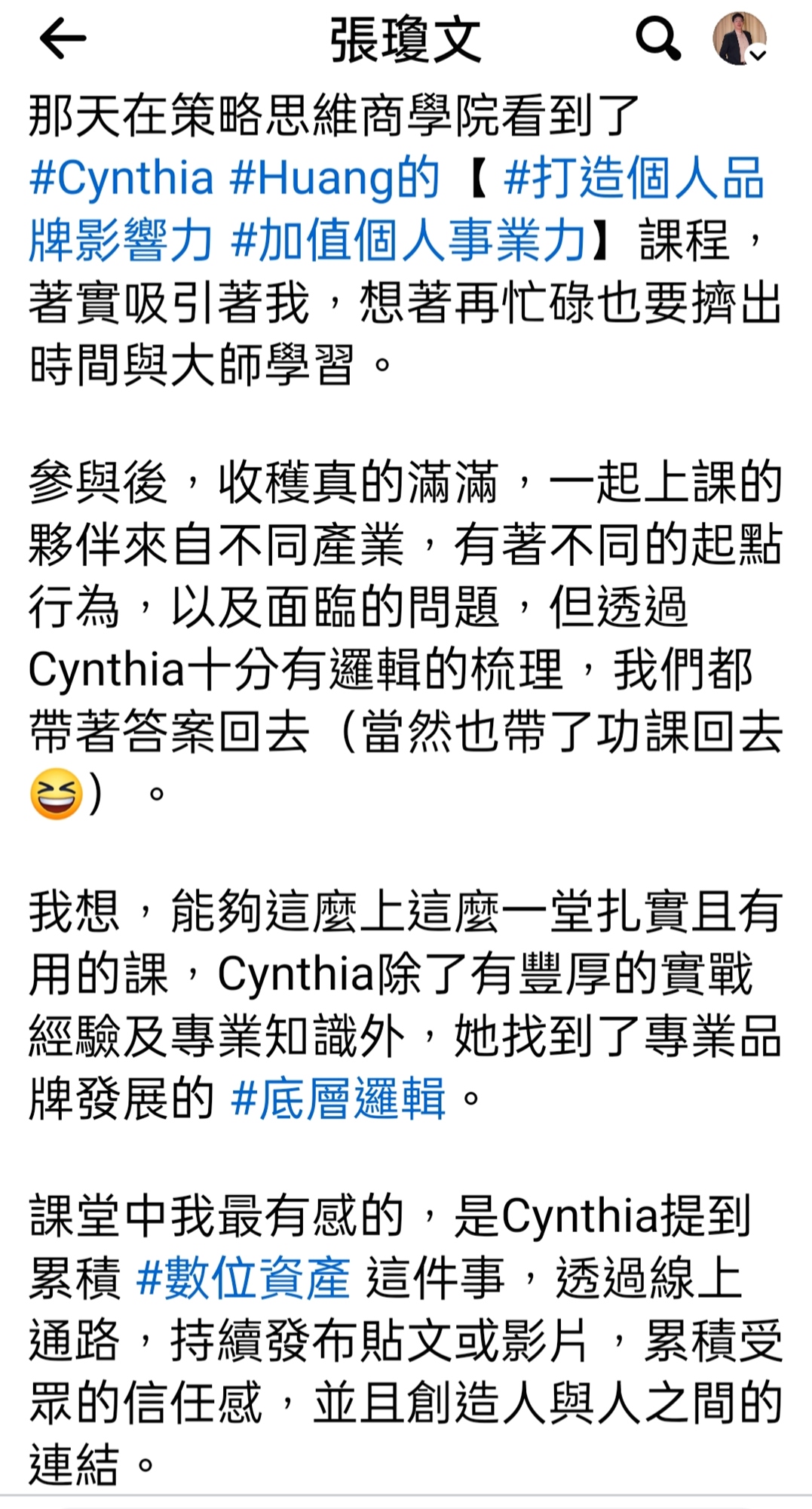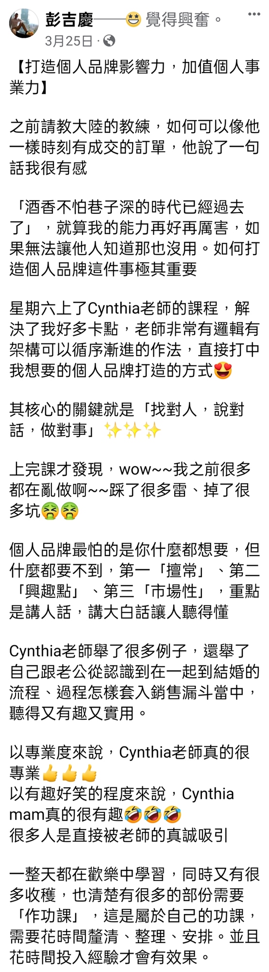 在粉專「不只是媽媽Cynthia」倡導透過個人品牌,讓生活每一天都能過成自己想要的樣子,讓自己每一天都能成為更喜歡的自己,邁向理想人生。組建「不只是媽媽」讀書會,協助更多想要自我實現和創業的媽媽們共學共好。期許幫助台灣更多中小企業和一人公司發展成長,讓台灣創業環境更多元豐富,提供下一代更多元的可能性發揮天賦。
