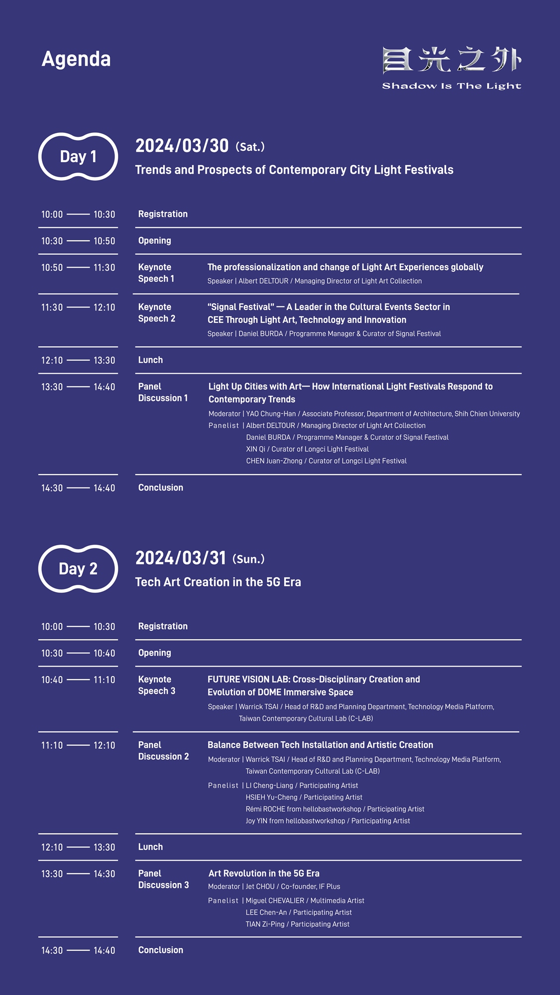 在科技與思潮變革下,現代城市呈現多元且流動的狀態,而「光節」也逐漸成為展現城市面貌的工具。當代光節不僅在視覺上建立城市美學,更進一步提出城市建構、生態及反思等積極論點,藉此回應社會議題與未來趨勢。因此,這場座談邀請到實踐大學建築設計學系專任副教授,同時也是「2022寶藏巖光節」策展人及聲光藝術家的姚仲涵擔任主持人,與「阿姆斯特丹燈節」子公司Light Art Collection總經理阿爾伯特・德爾圖(Albert DELTOU)、捷克「信號藝術節」節目籌劃經理暨策展人丹尼爾・布爾達(Daniel BURDA)、「龍崎光節-空山祭」策展人辛綺及陳雋中共同探討在不同文化背景與場域下,國際光節如何為該城市帶來新的動力,並以科技藝術為媒介,開啟大眾對於未來城市的討論。
