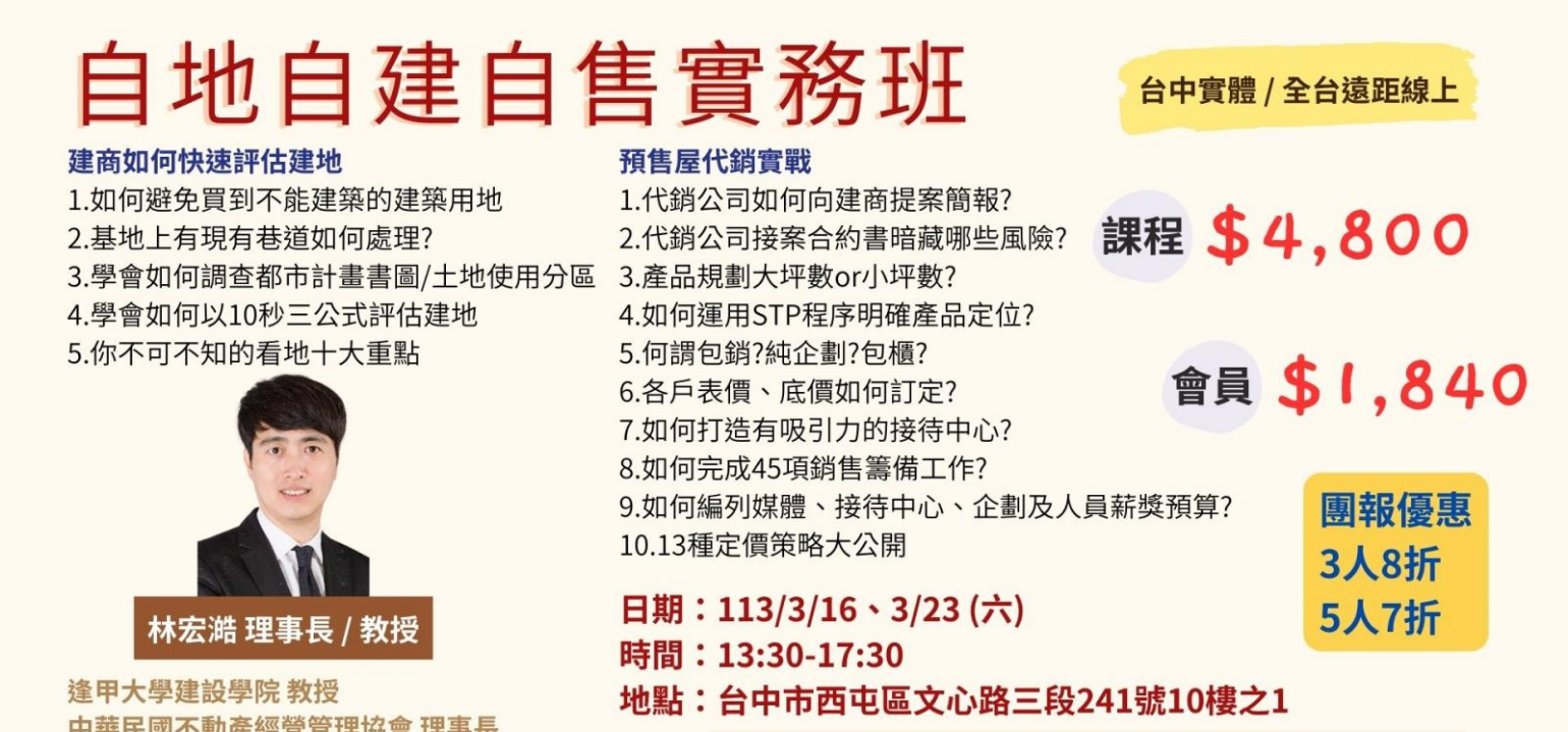 【台中實體課程/全台遠距教學】113年3/16起 自地自建自售實務班