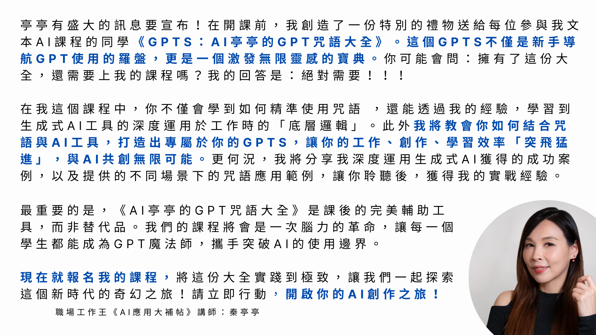 快參與我的課程,開啟你的AI文本、AI繪圖大師之路,讓工作、創作、學習效率「突飛猛進」,